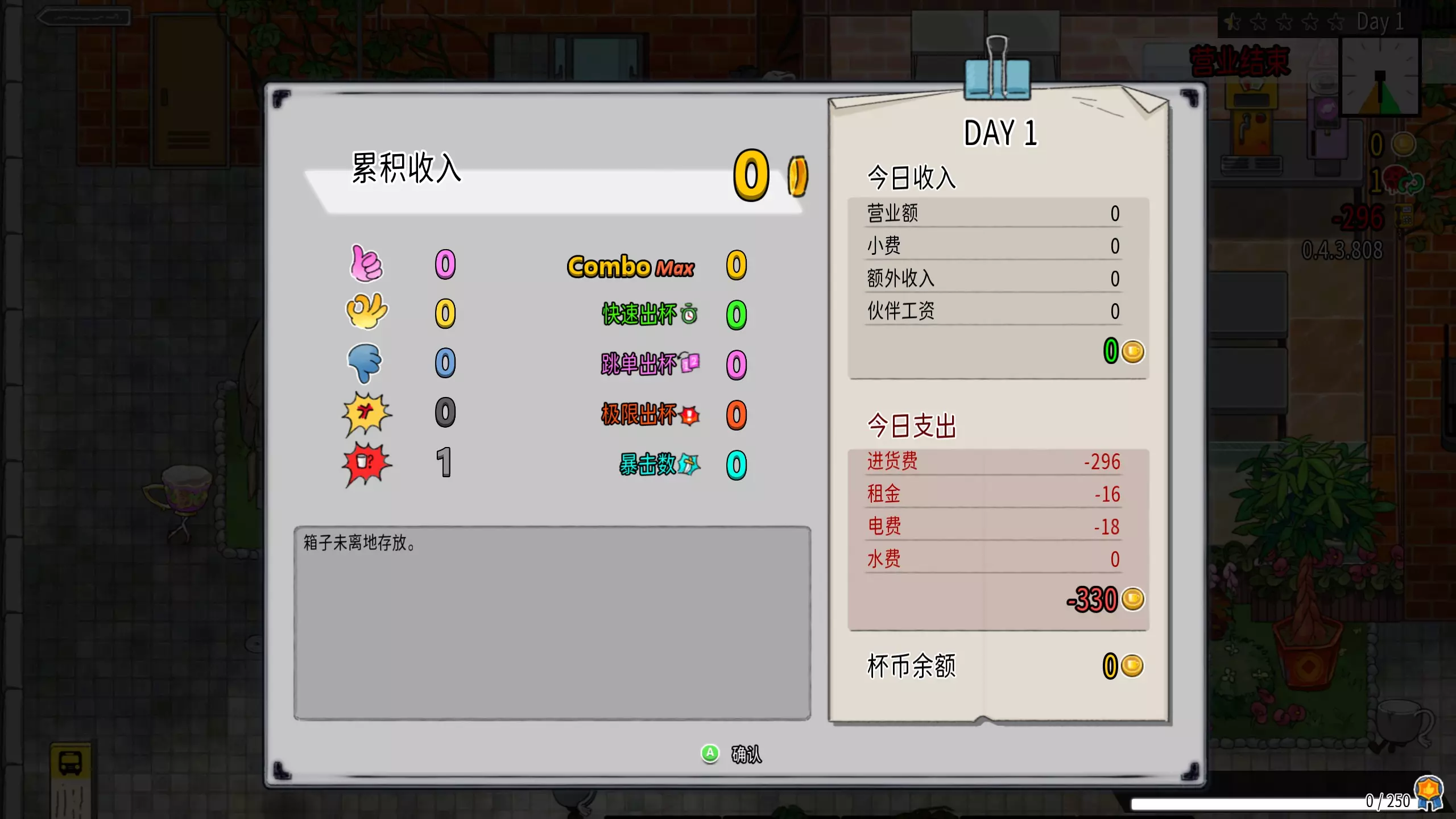 第一天开局默认进货费92,固定租金16,准时下班的电费18。(一定要准时下班!晚一点下班,电费都会涨!)总杯币还剩274。一箱鲜橙子是60杯币,一箱果糖/杯组是16杯币。开局先定四箱果糖/杯组,16×4=64,将尾数化整,总杯币还剩210。手册人我选择减70或者减30,如果有减70的手册人只需再买一箱鲜橙子(60)和五箱果糖/杯组(16×5=80),即可清零。