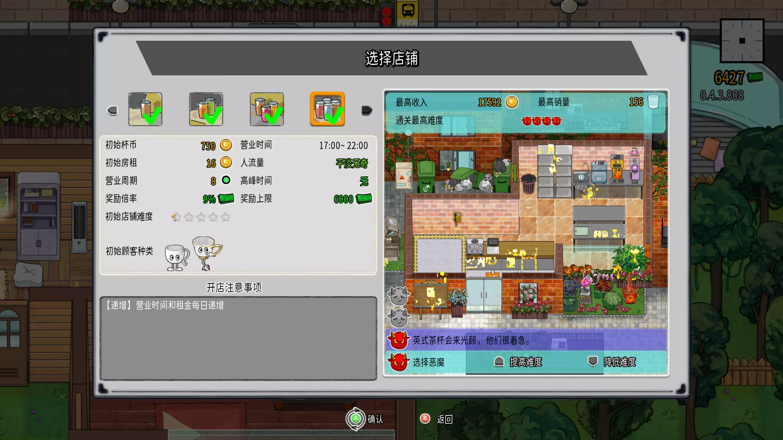 全程不做单!!只用订货搬货准时下班!!简单好上手!!推荐单人刷成就,能在关卡里暂停,多点时间算价格(数学好的当我没说)。关卡推荐:居民区1-4,难度2个恶魔(初始杯币较少,店铺设备少,容易刷到必备的商用制冰机)(客流量低,不会因为漏单压力爆表)