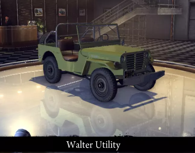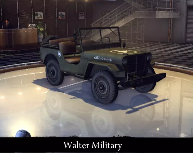 有趣的事实: - 原型为1955年款雪铁龙DS。 - 游戏中唯一的前轮驱动汽车。 Walter Military 军用和士兵使用的小型越野车(或吉普)。有民用版本——Walter Utility。 标准特性: 功率 45千瓦 最高速度 105公里/小时 重量 1041公斤 改进特性: 功率 57千瓦 最高速度116 千米/小时 重量 1041 千克 【运动改装】强化: 功率 57 千瓦 最高速度 116 千米/小时 重量 931 千克 【压缩机安装】强化: 功率 102 千瓦 最高速度 150 千米/小时 重量 931 千克