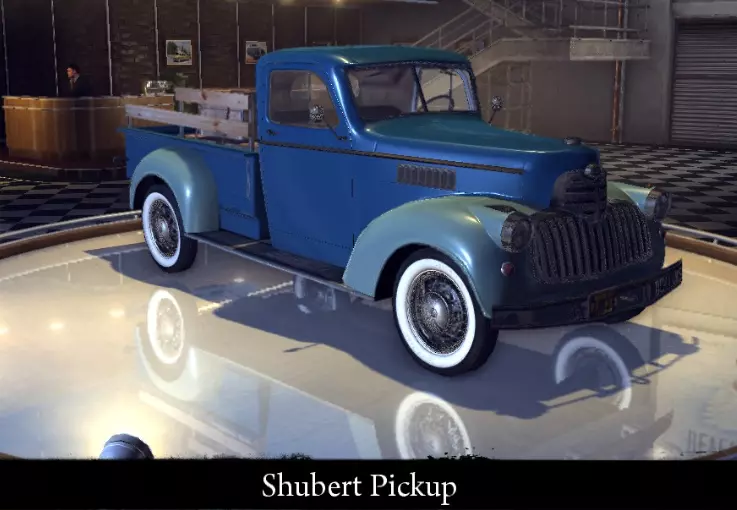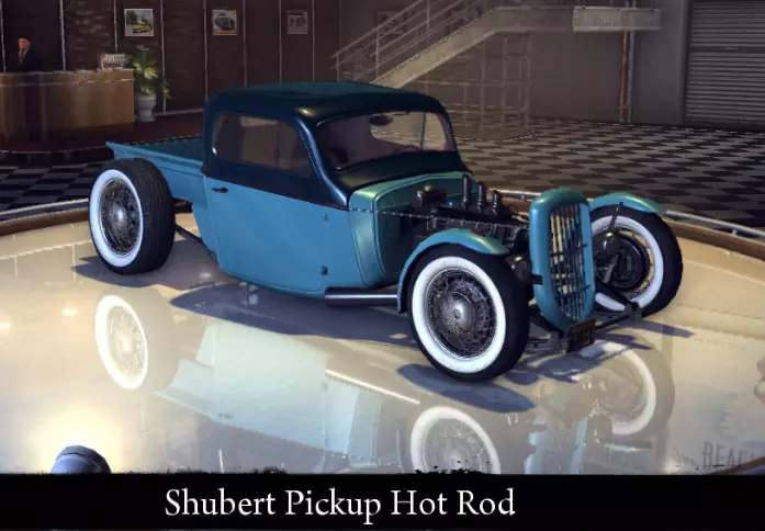 有趣的事实: - 原型为经典的1932年福特敞篷跑车。 - 未在游戏的汽车百科中出现。 舒伯特皮卡改装版 基于舒伯特皮卡打造的改装车。 标准性能: 功率 156千瓦 最高速度 178公里/小时 重量 1086千克 改进后性能: 功率 156千瓦 最高速度 178公里/小时 重量 1086千克 "运动改装"升级: 功率 156千瓦 最高速度178 千米/小时 重量 1086 千克 【压缩机安装】强化: 功率 229 千瓦 最大速度 203 千米/小时 重量 978 千克