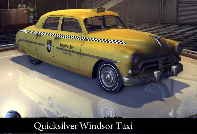 有趣的事实: *其原型为1950年款水星运动轿车。 快银温莎出租车 该车辆是快银温莎轿车的出租车版本。它在【帝国湾出租车公司】服役,用于在城市中接送乘客。 标准性能参数: 功率 82千瓦 最高速度 152公里/小时 重量 1620公斤 升级后性能参数: 功率 98千瓦 最高速度162 千米/小时 重量 1620 千克 【运动改装】强化: 功率 98 千瓦 最高速度 162 千米/小时 重量 1460 千克 【压缩机安装】强化: 功率 119 千瓦 最高速度 177 千米/小时 重量 1460 千克