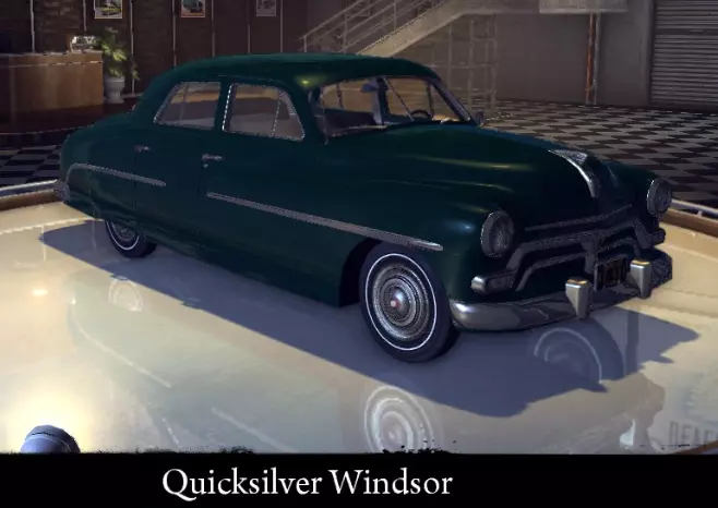 有趣的事实: - 原型为1953年款庞蒂亚克酋长轿车。 - 唯一一辆真实生产年份与游戏后半段时间线相符的车辆。 快银温莎 快银温莎是一款中型轿车,采用双色涂装。该车有两种版本:快银温莎和快银温莎出租车。这是一款造型经典、并无特别之处的普通汽车。其性能与波托马克印第安人相似。标准特性: 功率 82千瓦 最高速度 152公里/小时 重量 1620千克 强化特性: 功率 98千瓦 最高速度 162公里/小时 重量 1620千克 【运动改装】强化: 功率 98千瓦 最高速度 162公里/小时 重量 1460千克 【压缩机安装】强化: 功率 119千瓦 最高速度 177公里/小时 重量 1460千克