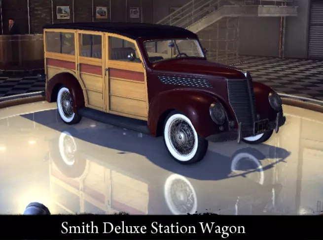 有趣的事实: 原型为1954年款福特Mainline。 Smith Deluxe Station Wagon Smith Deluxe Station Wagon是一款大型四座汽车。其简约的设计和良好的载客量使其在二战时期广受欢迎。 标准特性: 功率 61千瓦 最高速度 107公里/小时 重量 1485公斤 改进特性: 功率 77千瓦 最高速度115 千米/小时 重量 1485 千克 【运动改装】强化: 功率 77 千瓦 最高速度 115 千米/小时 重量 1330 千克 【压缩机安装】强化: 功率 96 千瓦 最高速度 127 千米/小时 重量 1330 千克