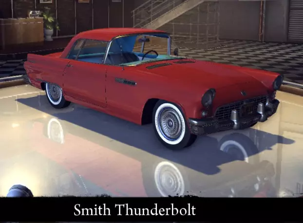 有趣的事实: - 原型为1937年款福特豪华木质旅行车。 - 尽管该车的原型于1937年推出,但直到1951年才出现在帝国湾的街头。 史密斯雷霆 史密斯雷霆在游戏接近尾声时大量出现在帝国湾的街头。从【我们的朋友】章节开始,玩家就可以驾驶该车自由行驶。直到游戏结束,这辆车就算不是帝国湾最知名的汽车,也占据着相当不错的地位。它可以被归为性能强劲的中等车型,特点是速度快且灵活。 标准特性: 功率 144千瓦 最高速度 189公里/小时 重量 1352公斤 改进特性: 功率 173千瓦 最高速度196 千米/小时 重量 1352 千克 【运动改装】强化: 功率 173 千瓦 最高速度 196 千米/小时 重量 1215 千克 【压缩机安装】强化: 功率 212 千瓦 最高速度 218 千米/小时 重量 1215 千克