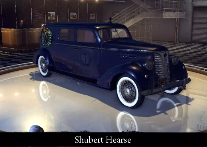 有趣的事实: - 原型为1938年款雪佛兰Master Sedan Delivery。 - 车辆名称源自1940年款更大的雪佛兰Panel Truck厢式货车。 舒伯特38灵车 舒伯特38灵车是舒伯特38厢式货车的加长版。在游戏世界中,这款车作为灵车用于运送棺材。它的速度相当慢,但比舒伯特38厢式货车快一些。 标准性能参数: 功率 62千瓦 最高速度128 千米/小时 重量 1630 千克 改进后性能: 功率 75 千瓦 最高速度 134 千米/小时 重量 1630 千克 【运动改装】改进: 功率 75 千瓦 最高速度 134 千米/小时 重量 1491 千克 【压缩机安装】改进: 功率 111 千瓦 最高速度 157 千米/小时 重量 1491 千克