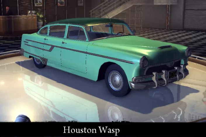 有趣的事实: - 其原型为1941年款林肯大陆敞篷车。 - 在“甜蜜的家”章节中,维托·斯卡莱塔将该车称为“杰斐逊42”。数字“42”可能是汽车生产年份的一部分——1942年。 休斯顿黄蜂 这是一款在游戏中呈现的50年代汽车中设计独特的车型。该车以“盒式”设计和性能出色的引擎脱颖而出,这表明其最初是为纳斯卡(NASCAR)新型赛事打造的。在各项数据上,该车实际上都超越了其竞争对手Quicksilver Windsor。 标准特性: 功率 119千瓦 最高速度 162公里/小时 重量 1636公斤 改进特性: 功率 143千瓦 最高速度168 千米/小时 重量 1636 千克 【运动改装】强化: 功率 143 千瓦 最高速度 168 千米/小时 重量 1470 千克 【压缩机安装】强化: 功率 172 千瓦 最高速度 178 千米/小时 重量 1470 千克