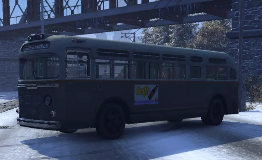 有趣的事实: - 原型为GMC CCKW 353和Studebaker US6。 - 未在游戏内【汽车百科】中出现。 Parry Bus 乘客巴士。该巴士为【Empire Bay Transport Lines】公司服务,用于运送乘客。40年代车身为绿色,50年代为米色。在城市内运行,白天更为常见。终点站位于【Aptown】和【Millville】。 标准特性: 功率 209千瓦 最高速度 132公里/小时 重量 3616公斤