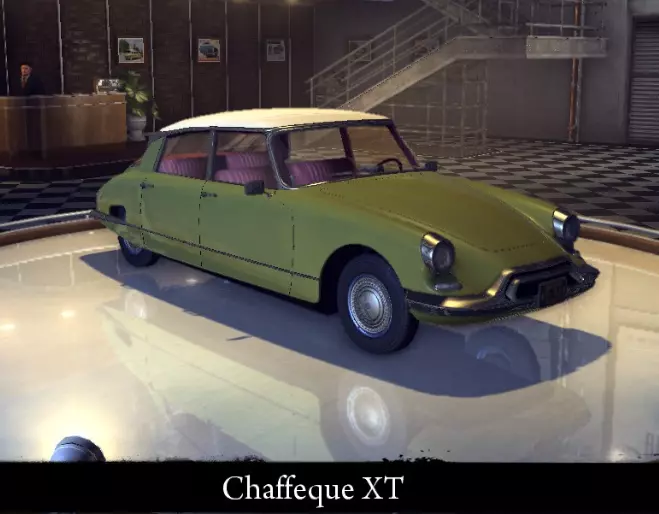有趣的事实: - 原型为Arlington Torpedo。 - 与《四海兄弟:失落的天堂》中的Lassiter V16 Phaeton有少许相似之处。 Chaffeque XT 这是一款小型法国汽车。其狭窄的轴距和向尾部保险杠倾斜的车顶看起来有些滑稽。该车采用前轮驱动。后翼子板上有小型“盖板”,部分遮挡后轮。低调的车灯和欧式轮廓能在瞬间将你从腐朽不堪的帝国湾黑手党世界带到鲜花盛开的巴黎窄巷。 标准性能: 功率 56千瓦 最高速度 150公里/小时 重量 1120公斤 强化性能: 功率 74千瓦 最高速度 165公里/小时 重量 1120公斤 "运动改装"强化: 功率 74千瓦 最高速度165 千米/小时 重量 1010 千克 【压缩机安装】强化: 功率 91 千瓦 最大速度 181 千米/小时 重量 1010 千克