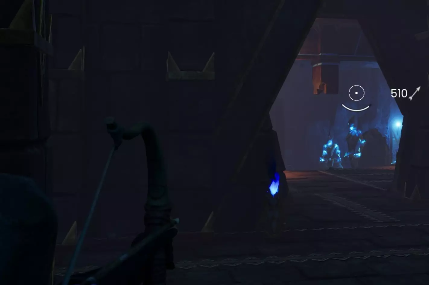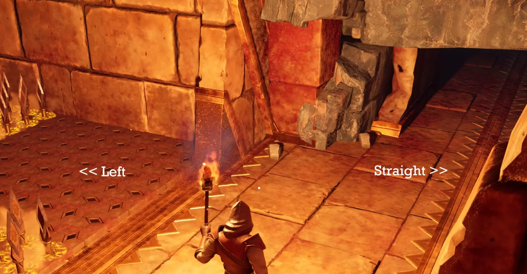 直行 屏障后方有一个墙壁陷阱、一些 dwellberries 和一个铜矿节点。 左转 你左侧的房间里有几个敌人。将它们全部吸引仇恨,然后沿着来路跑回,下楼梯到压力板陷阱之间的安全区域。敌人会被吸引并追赶你,每次压力板陷阱触发时都会受到伤害。当它们到达你身边时几乎已经死亡,因此很容易将其消灭。