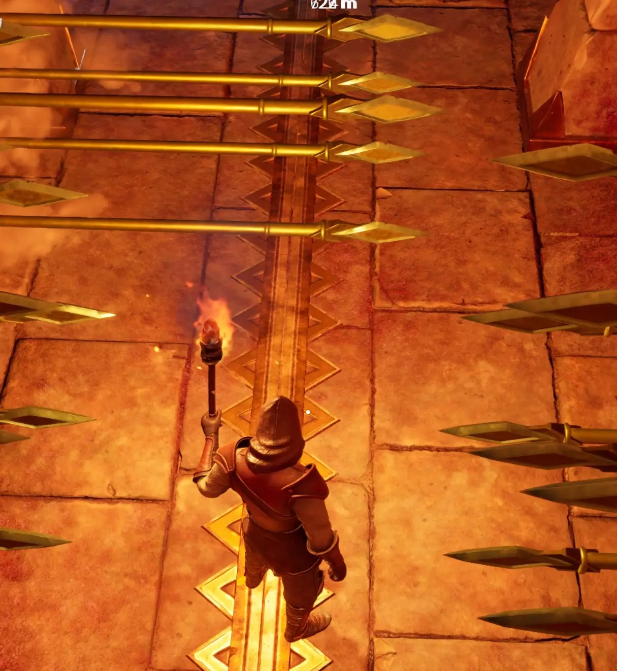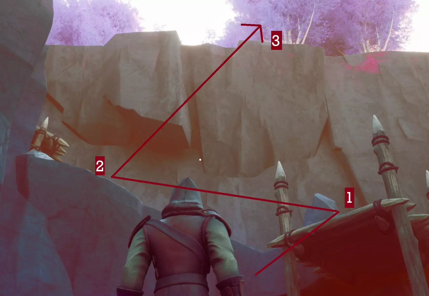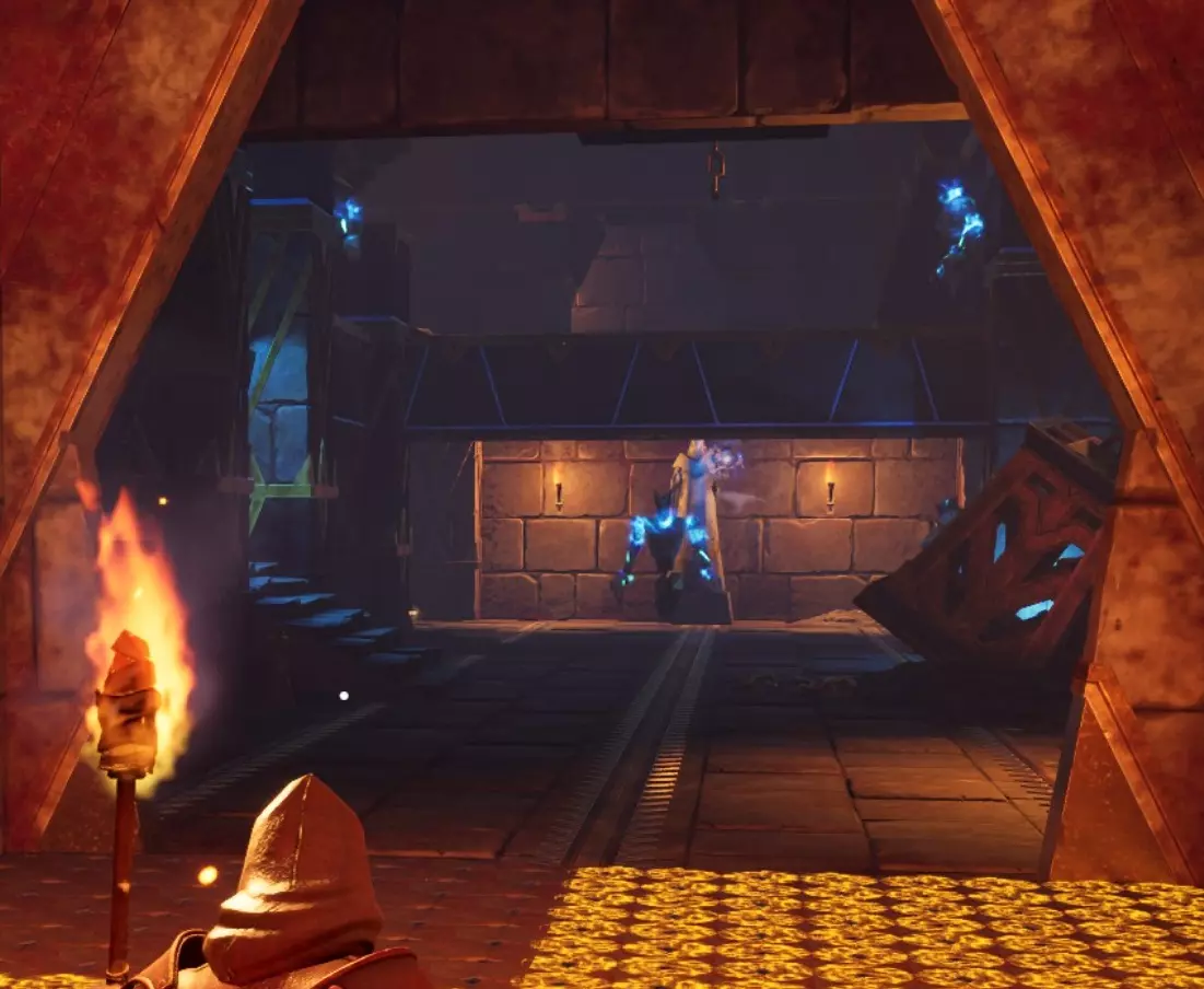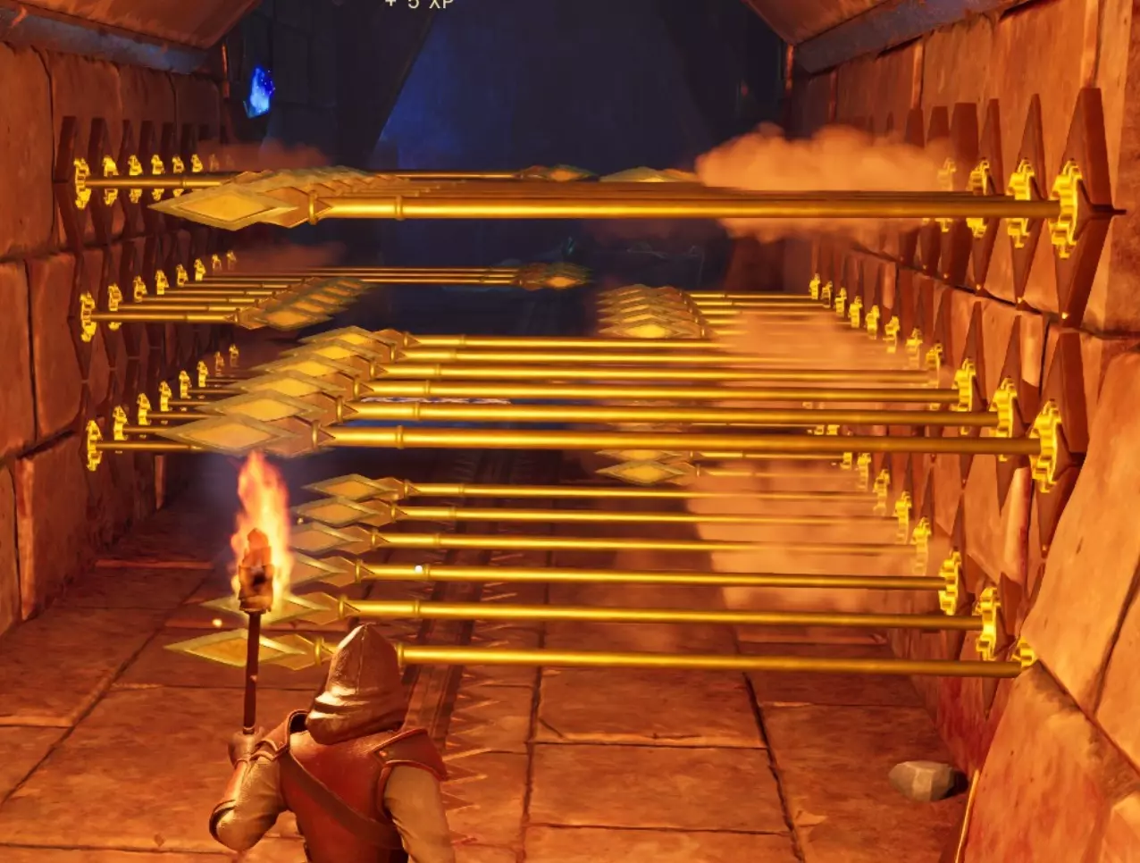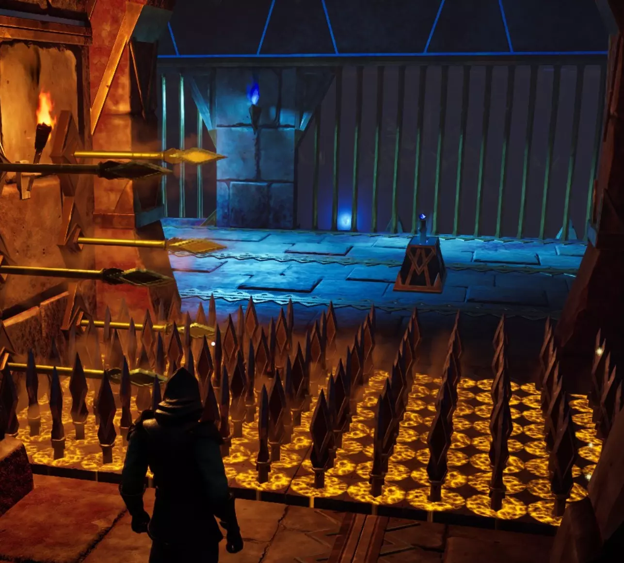 它的左侧是一个墙壁陷阱,再过去是几个锡矿节点。小路通向一个拉杆,拉杆前有一个地板和墙壁尖刺组成的双重陷阱。