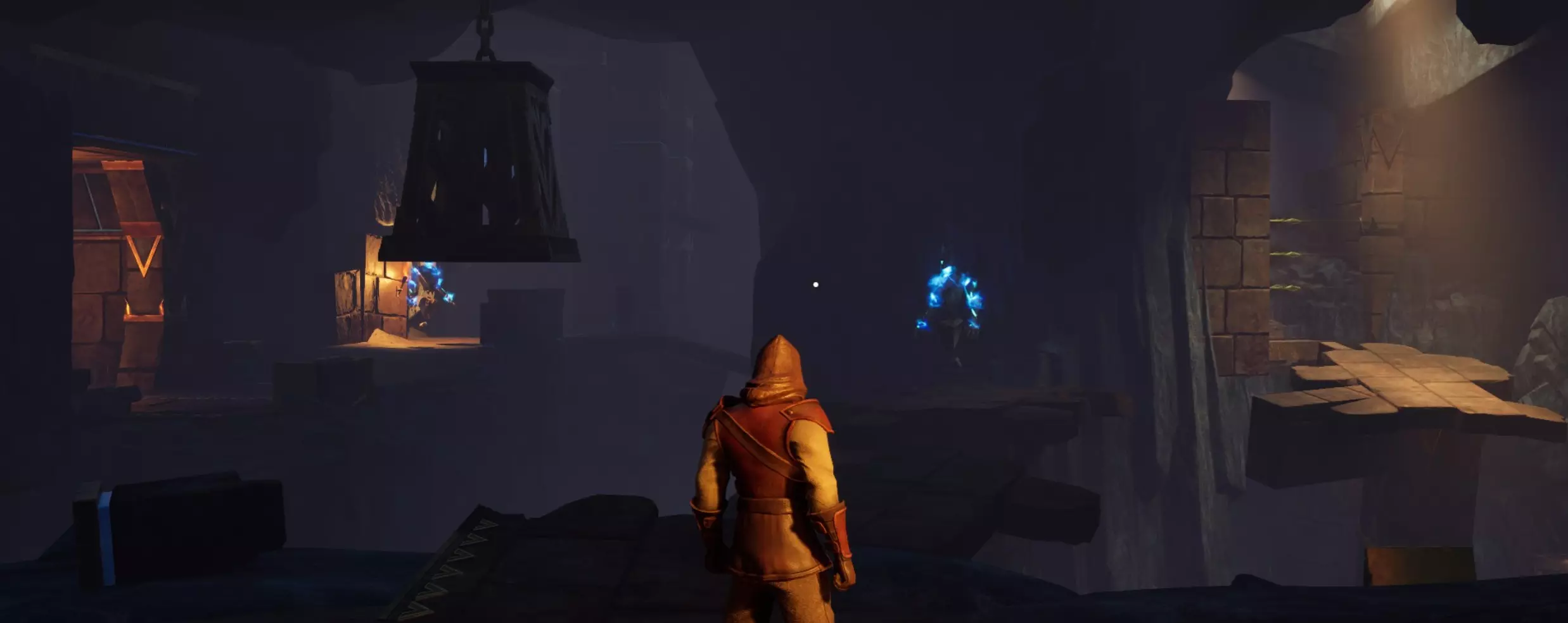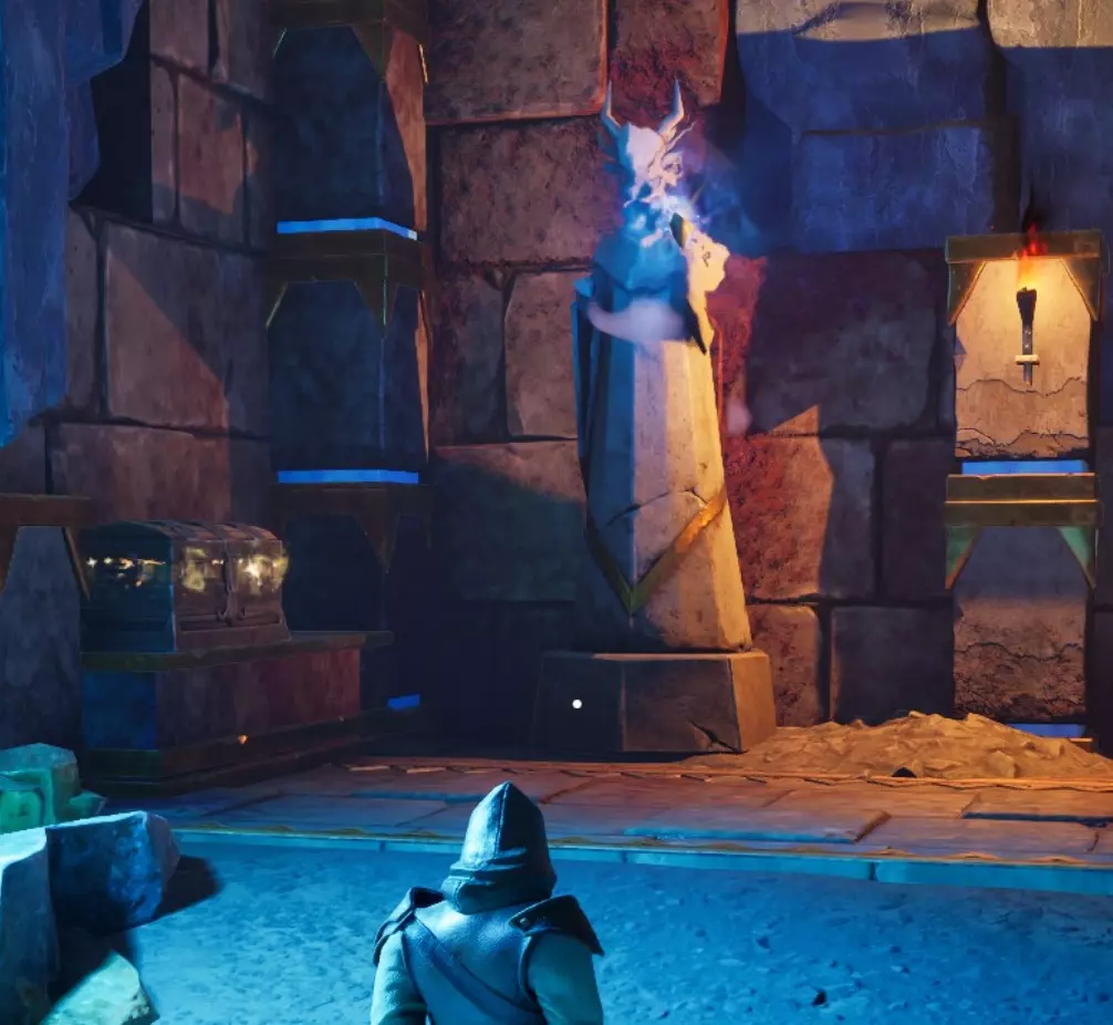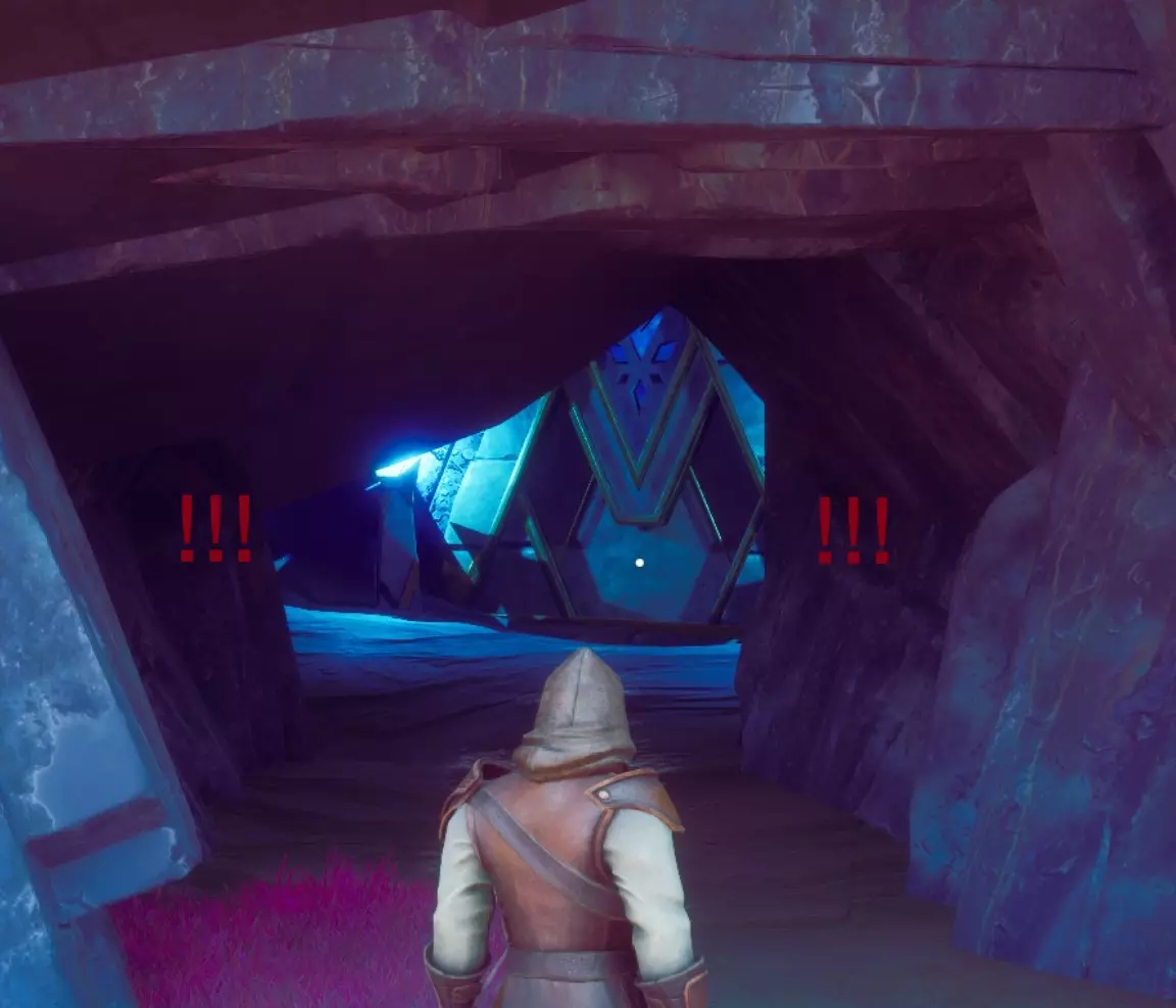 穿过门是一个“T”字形交叉路口。右侧是一个锡矿节点,左侧是一个墙壁陷阱。陷阱后面的路径会引导你向左走,但转身看向身后右侧,那里有一个宝箱。这条路径通向一个大房间,里面有几个需要你通过的平台。前方有2个哨兵。地面上有一些老鼠、符文精华节点和铜矿节点。