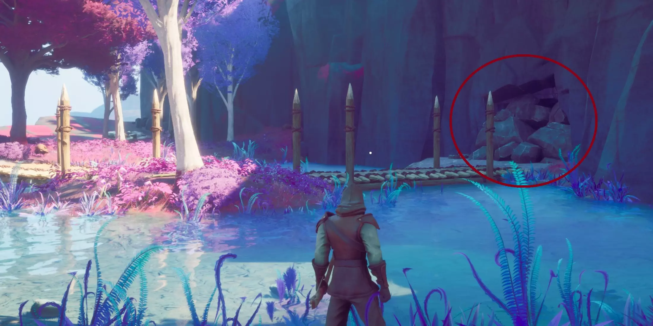 不要冲进洞穴,因为洞穴两侧视线外有河豚植物,当你离得太近时它们就会爆炸。由于空间狭窄,如果你冲进去,它们就会爆炸,你很可能会死亡。