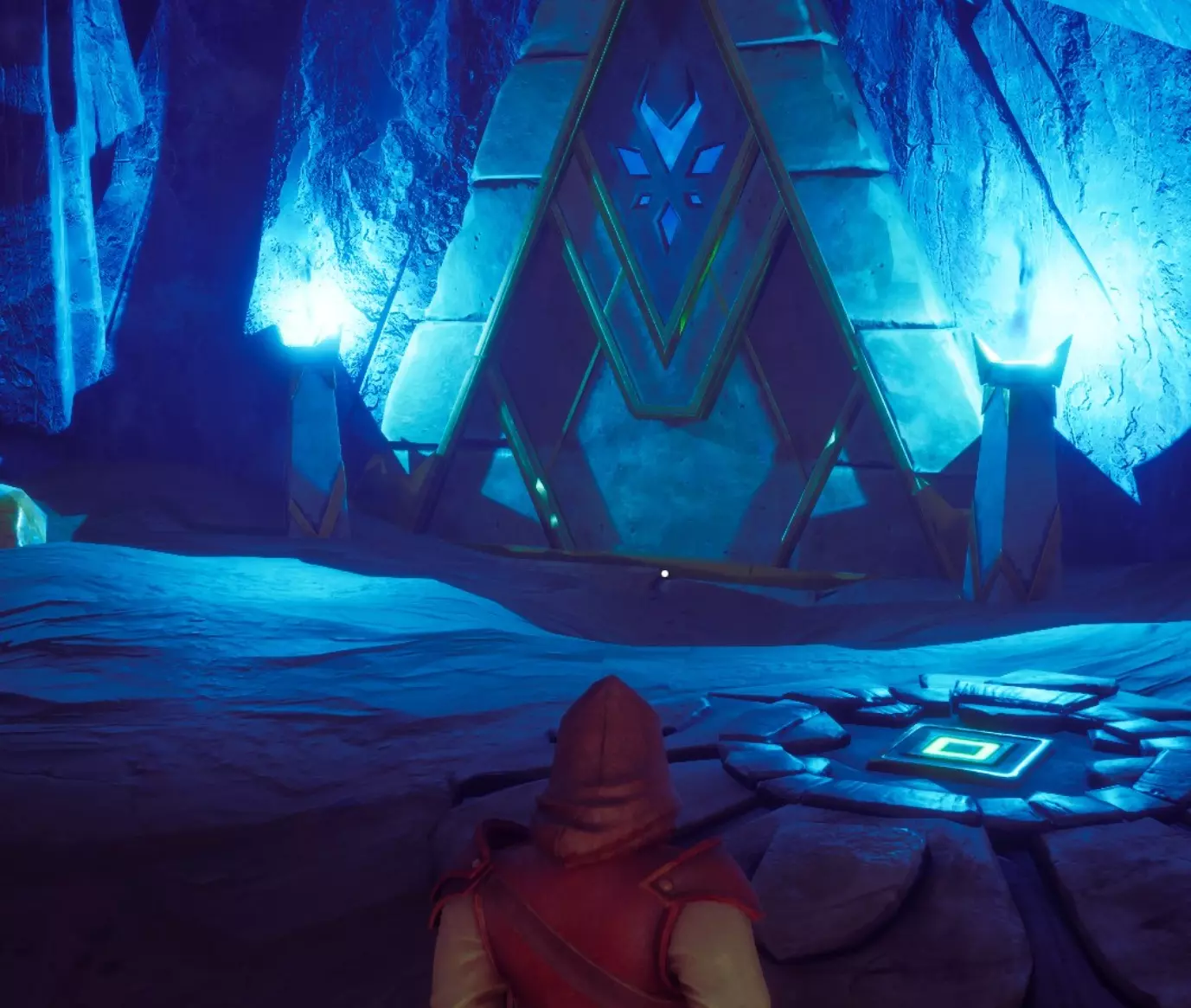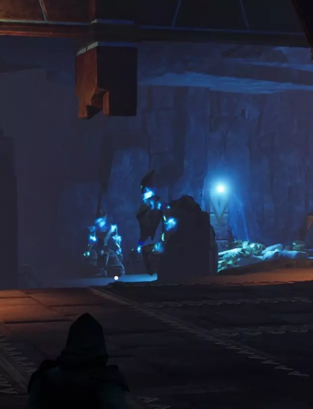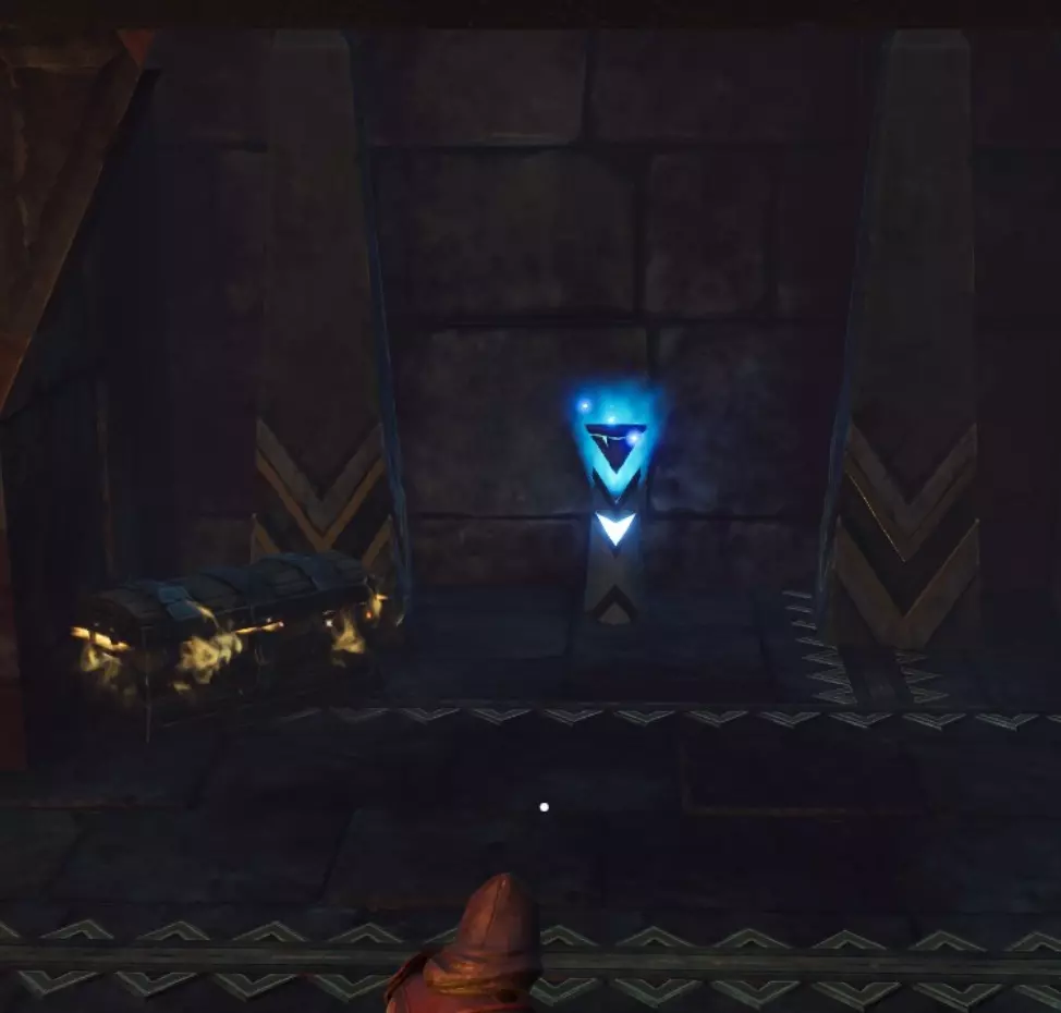 你很可能会同时吸引多个敌人的仇恨,所以要把它们拉回第一个房间再战斗。你需要节省耐力,通过翻滚躲避危险,只在安全的时候发动攻击。如果引到了浩克和哨兵,优先集中火力对付哨兵。 幸运的是,这个房间就在宝库入口旁边,如果你被敌人压制,可以退出去让它们重置。当你离开宝库时,敌人会恢复满血,所以在决定离开宝库时要考虑到这一点。 敌人所在房间的右侧有一个宝箱,以及一些砂岩和符文精华节点。前方的道路上有一系列陷阱,它们看起来比实际危险得多。