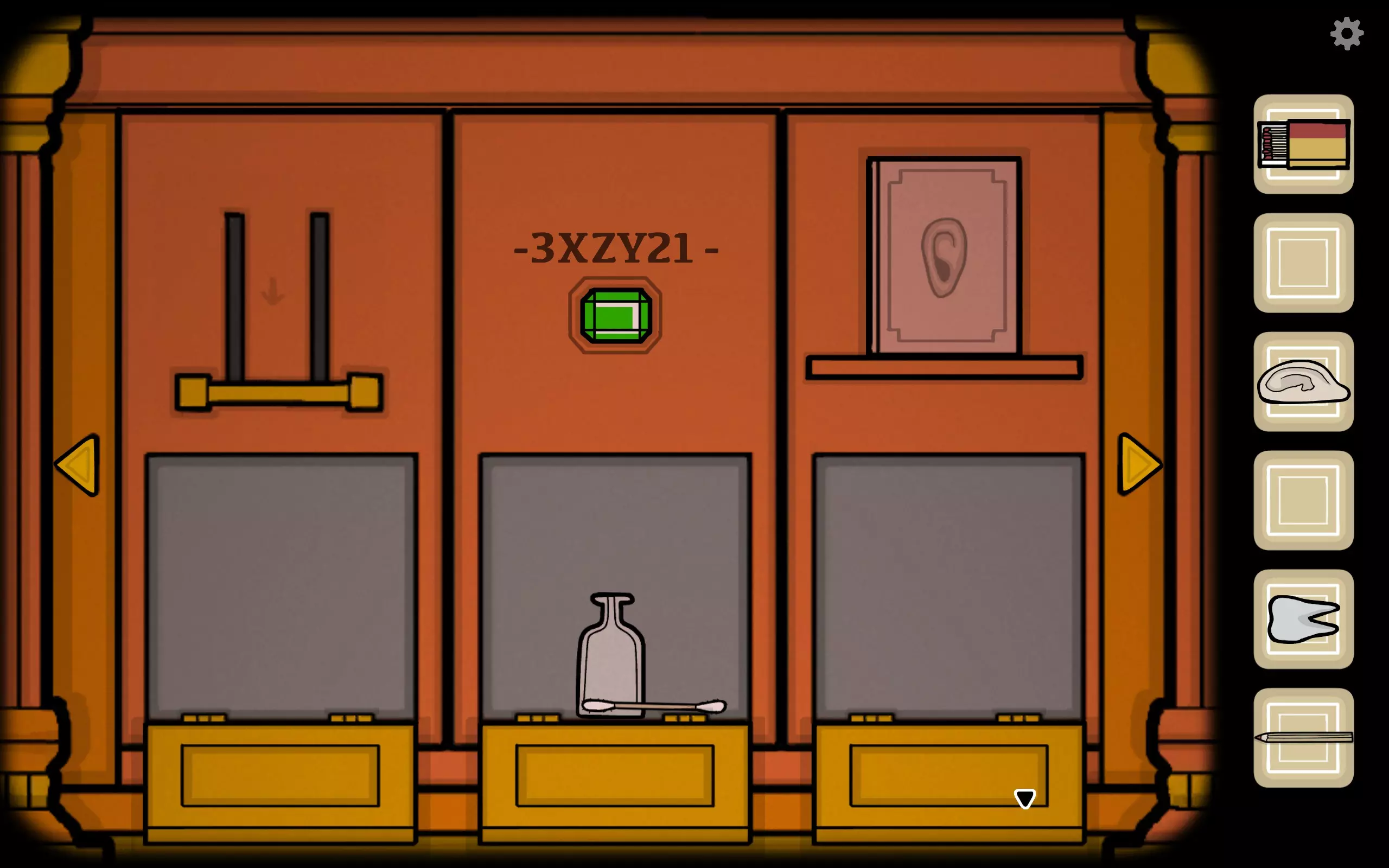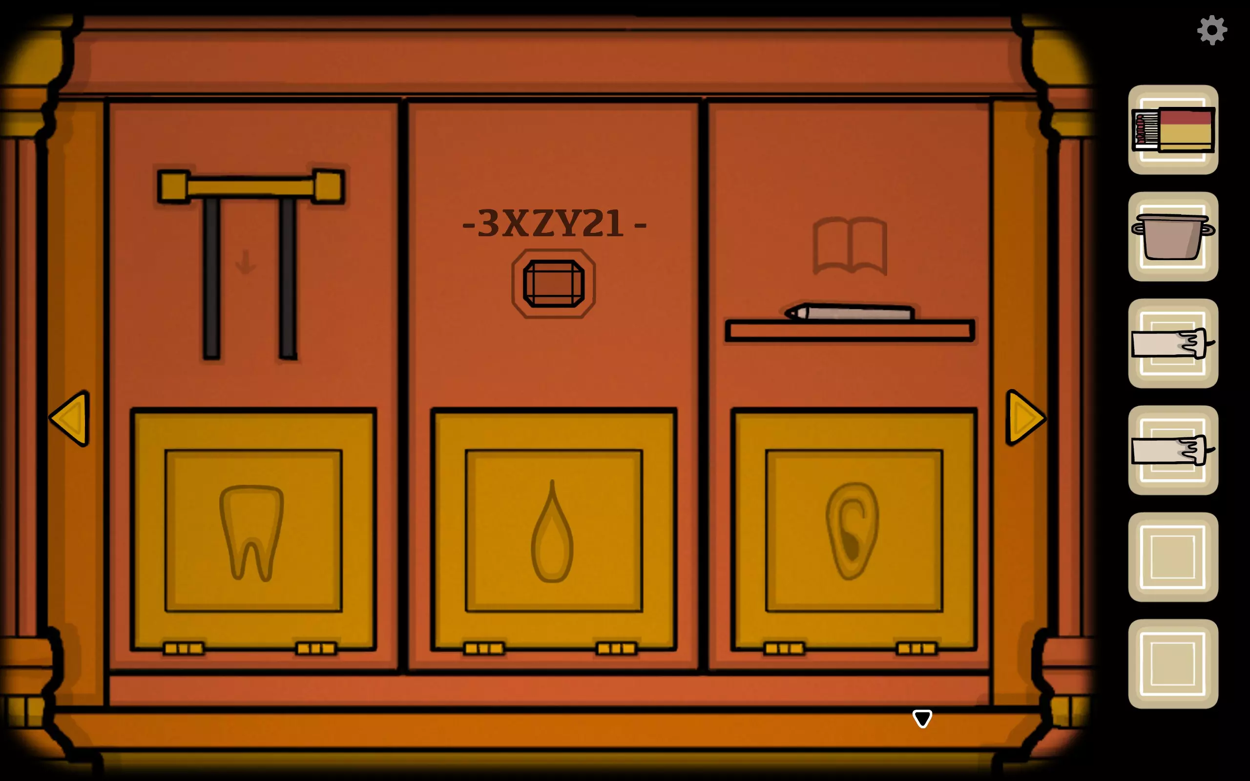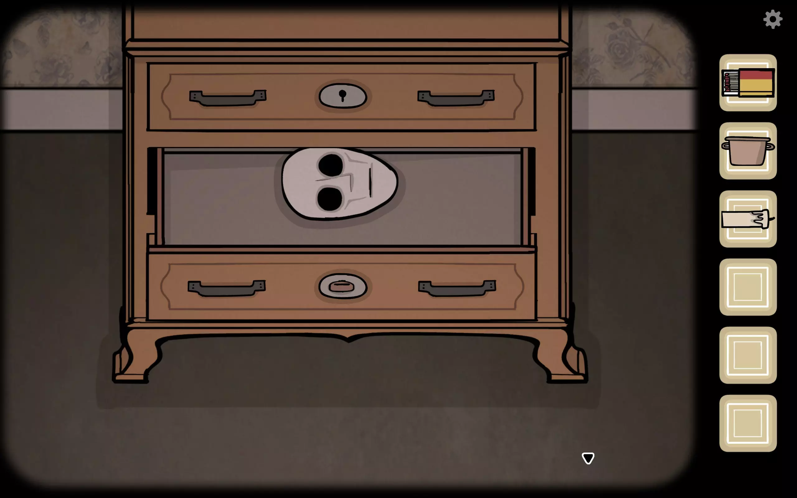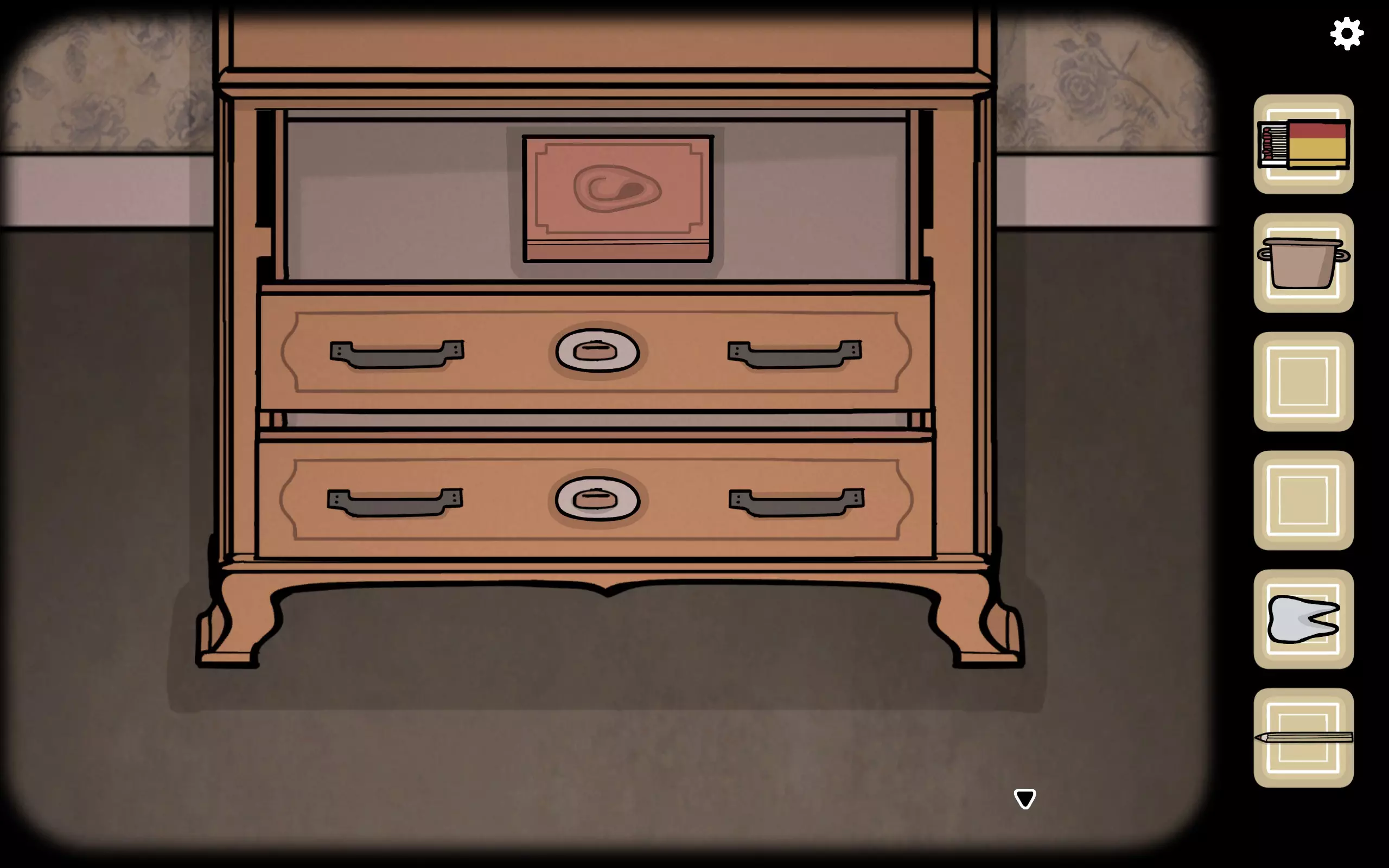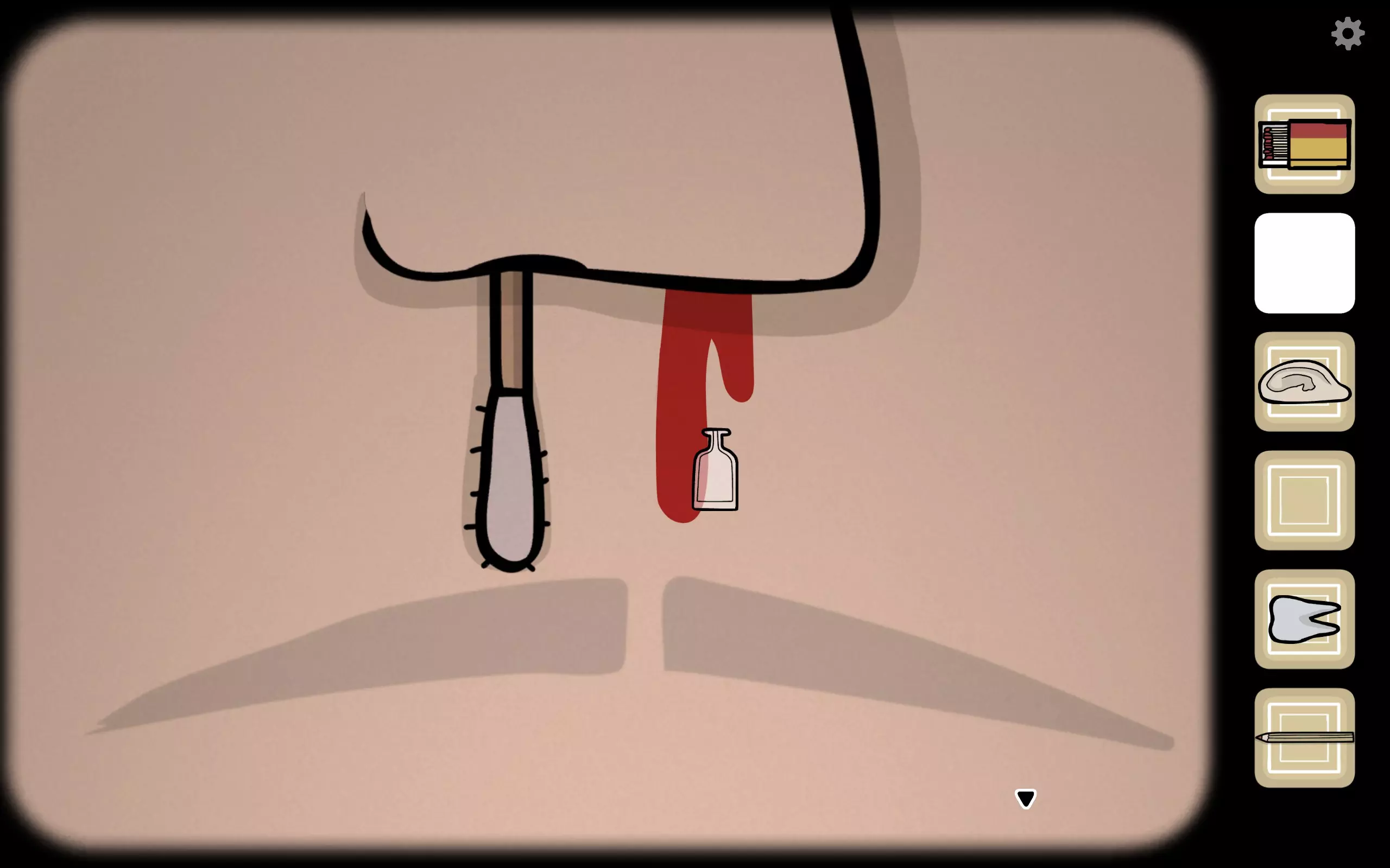 获得一个三角形块,放入之前柜子缺失的三角形槽中,即可打开柜子。三栏分别对应骨(牙齿)、血(鼻血)、肉(耳朵)。右上角可获得铅笔。