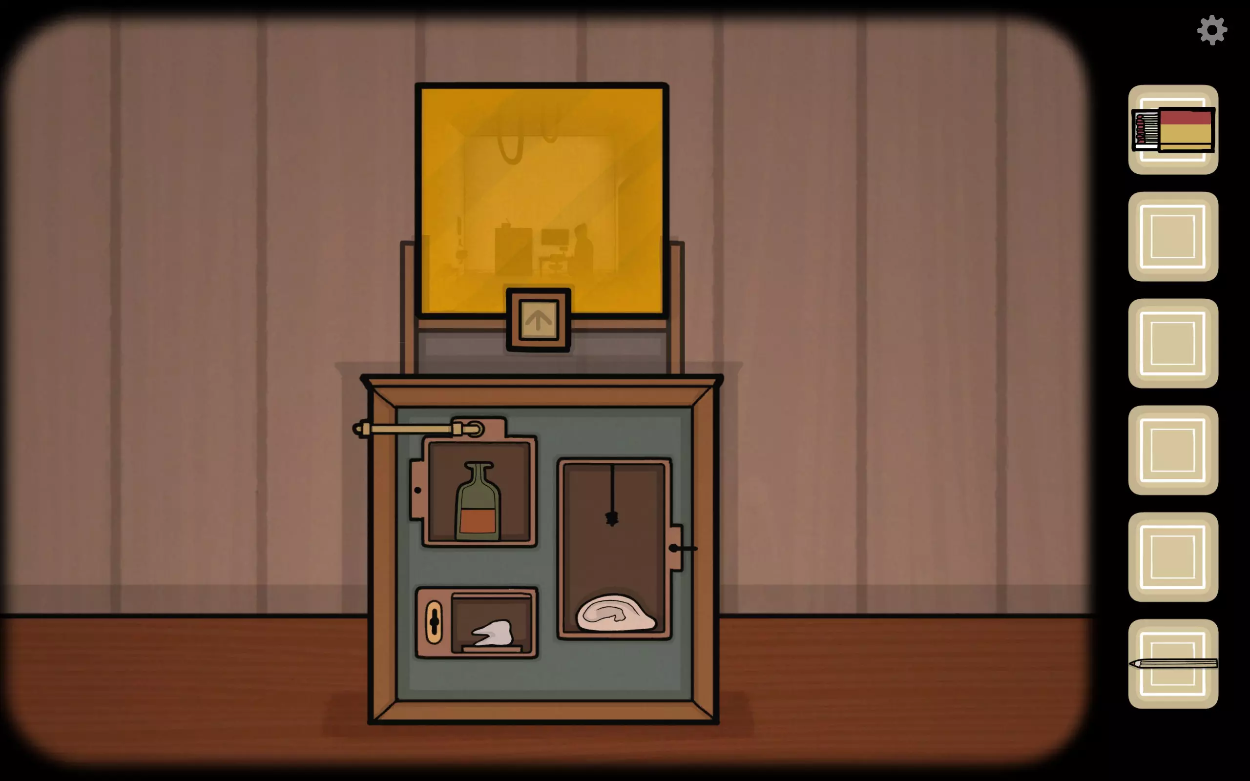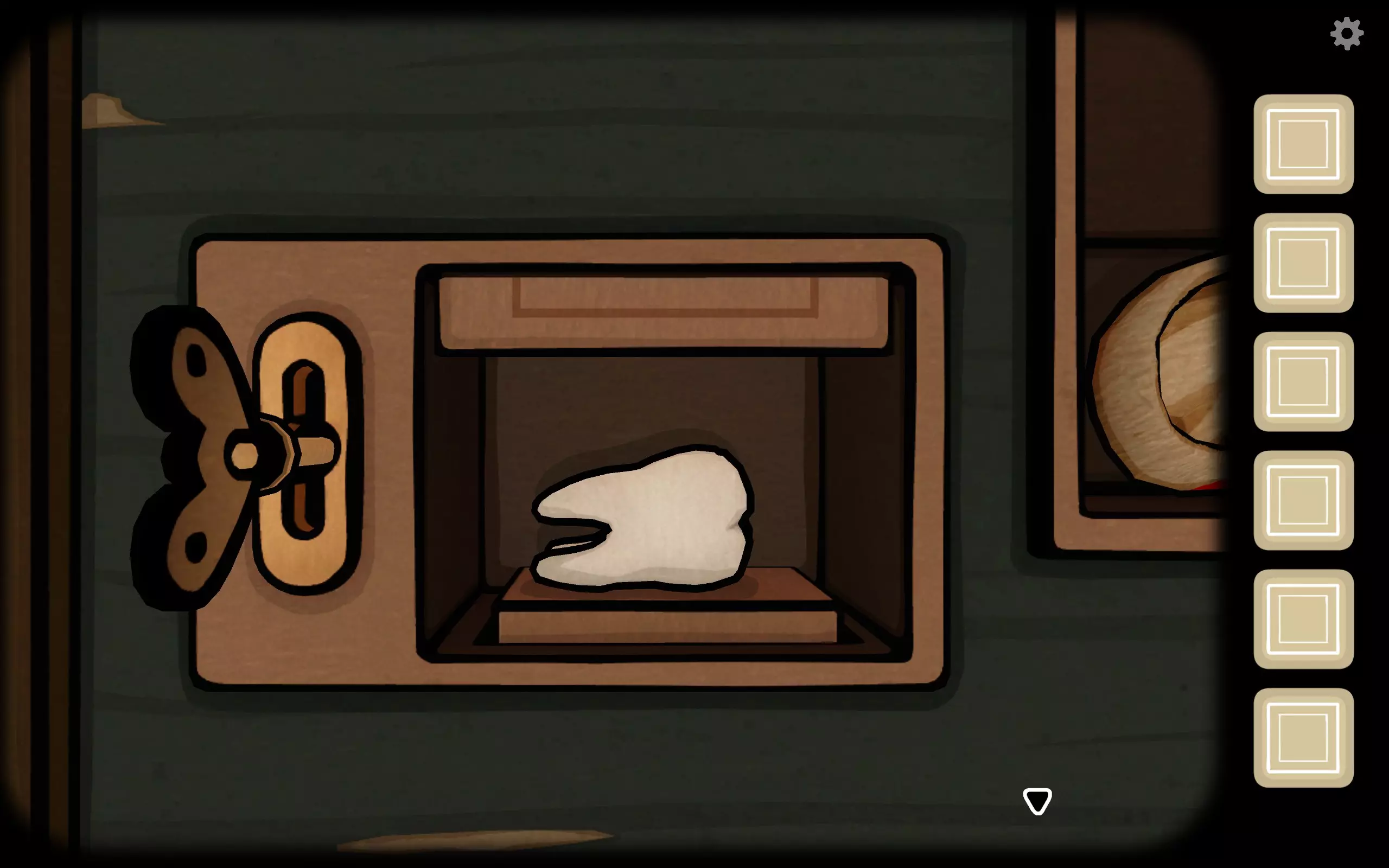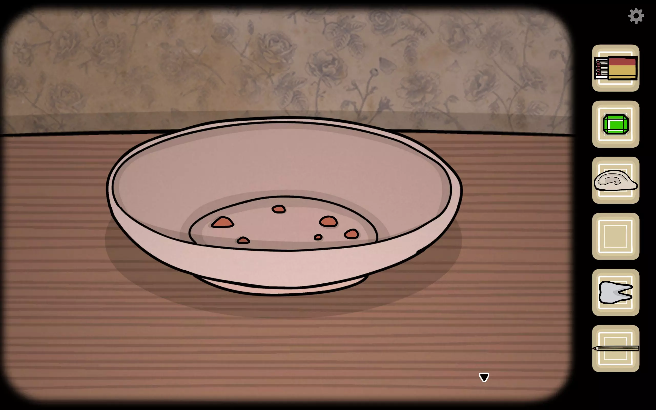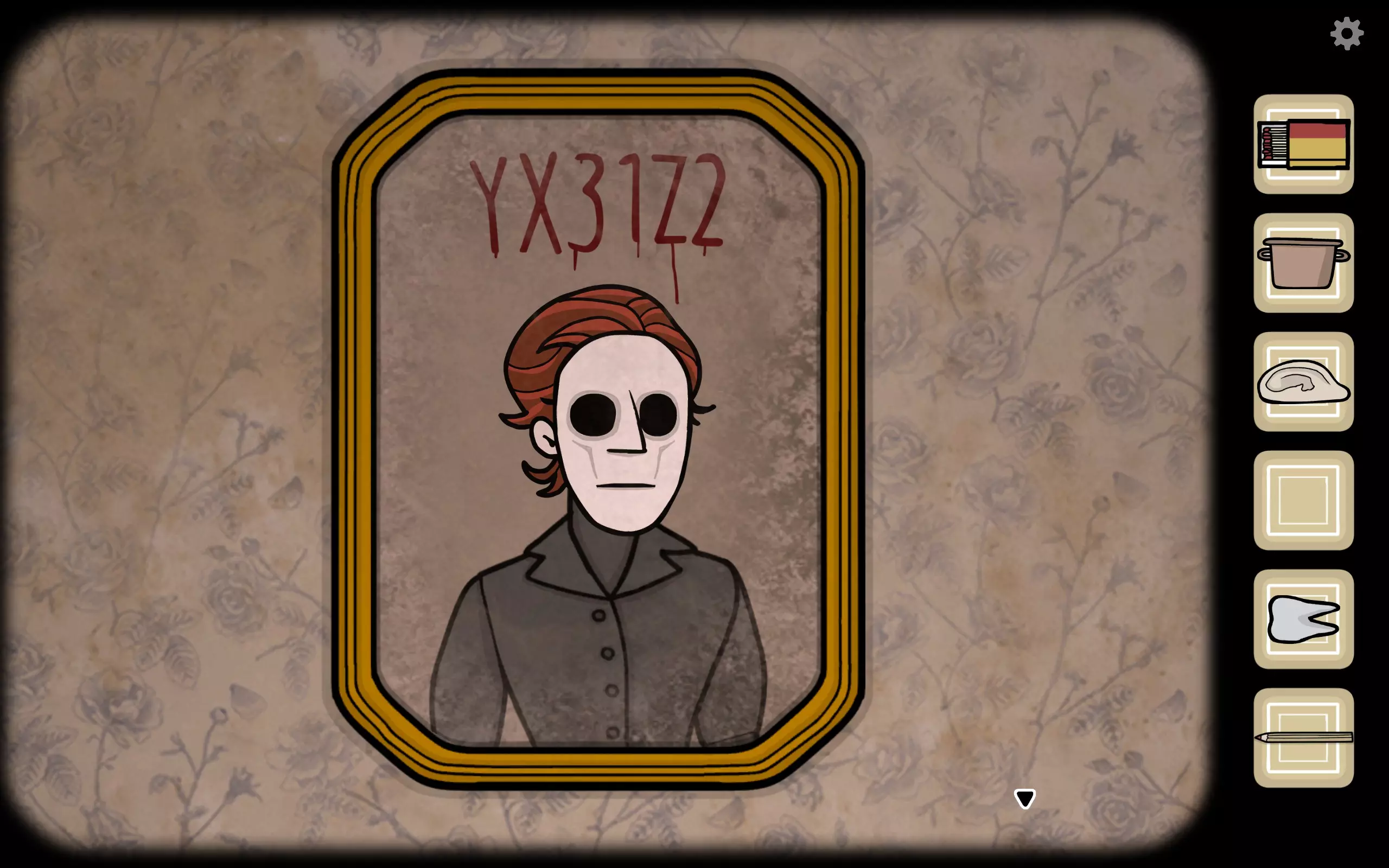 获得一个三角形块,放入之前柜子缺失的三角形槽中,即可打开柜子。三栏分别对应骨(牙齿)、血(鼻血)、肉(耳朵)。右上角可获得铅笔。