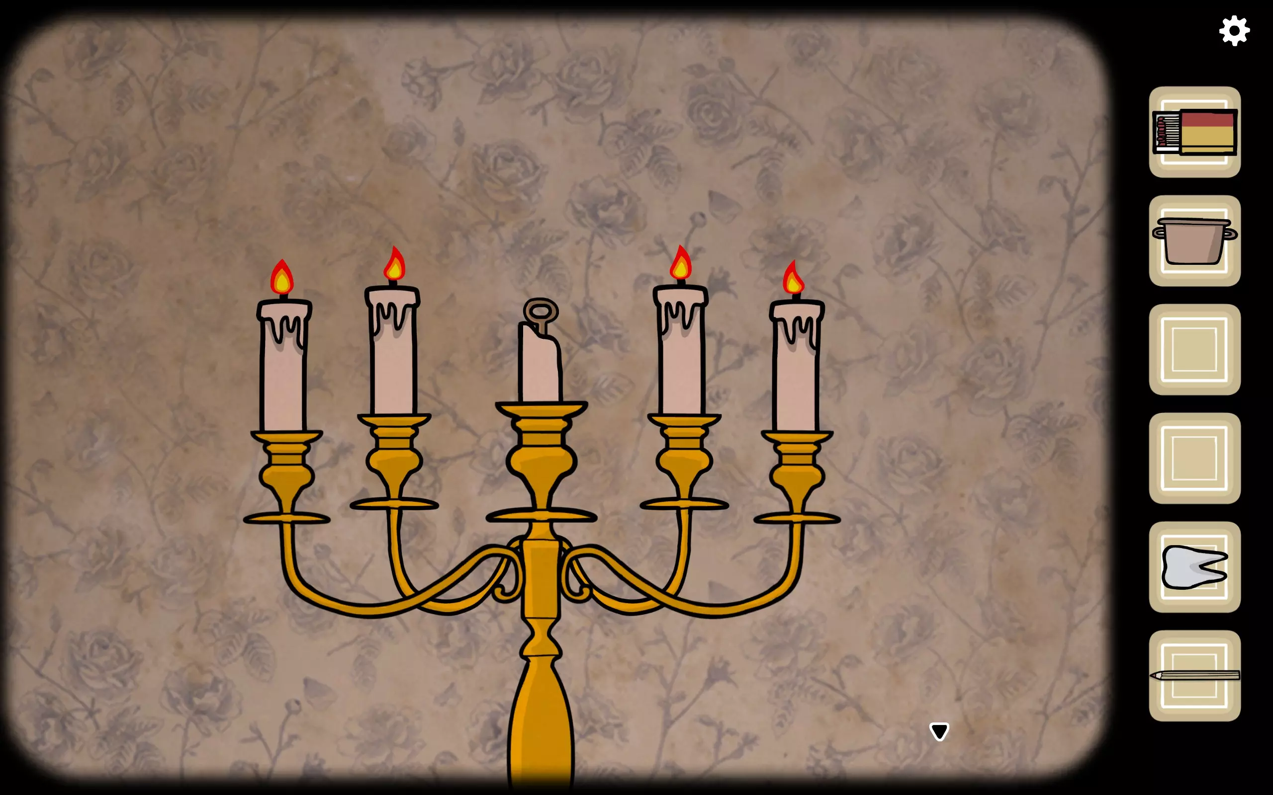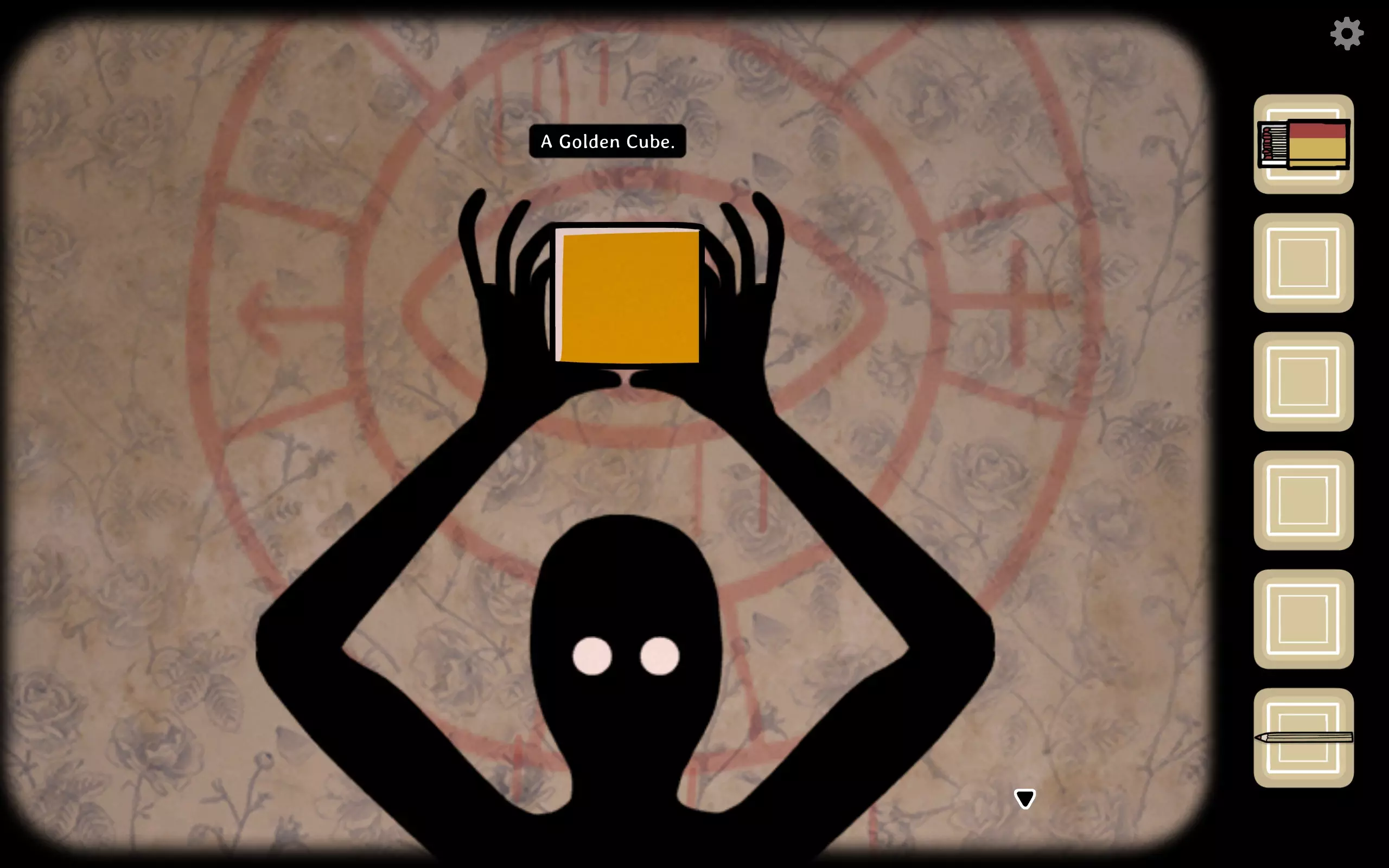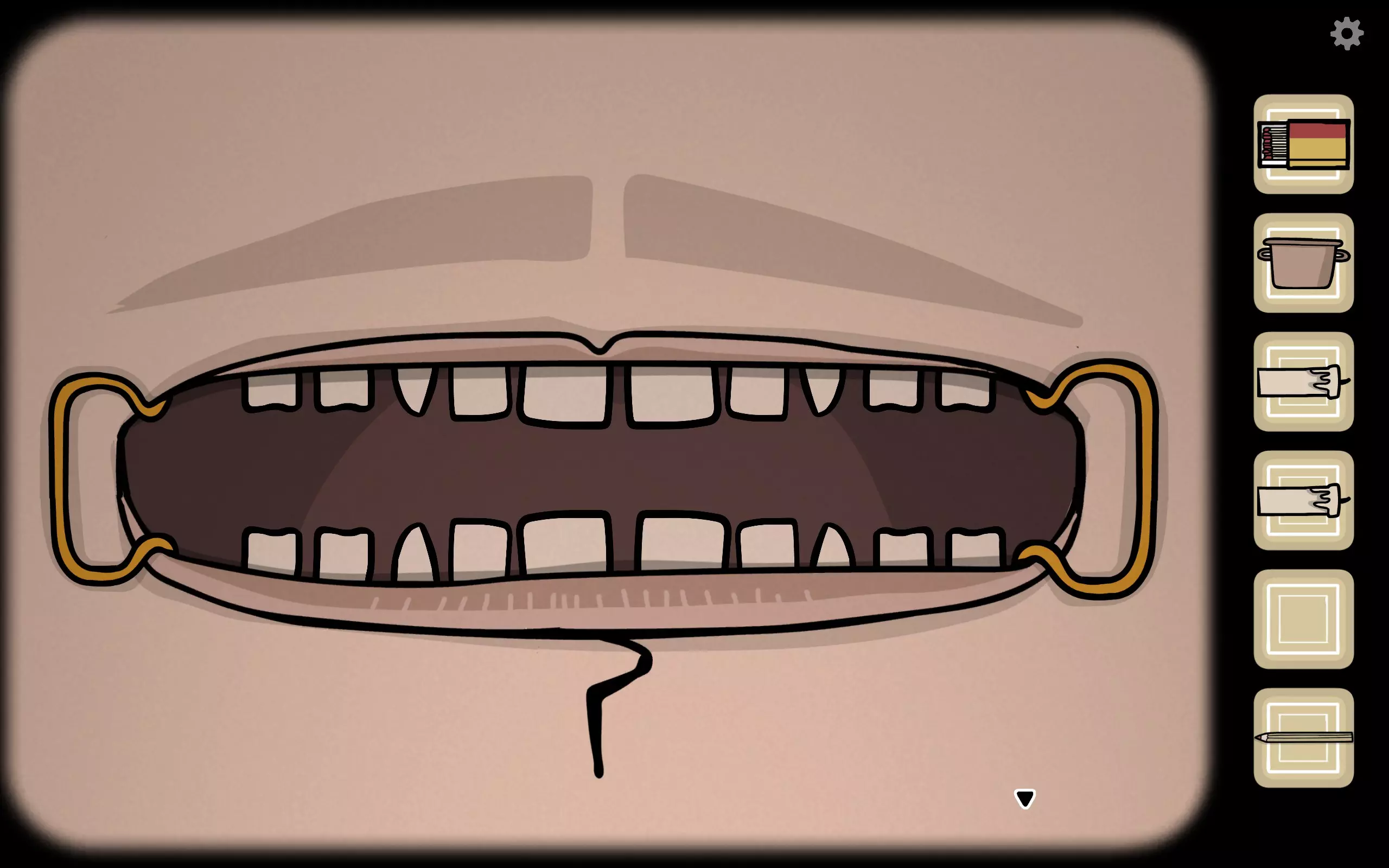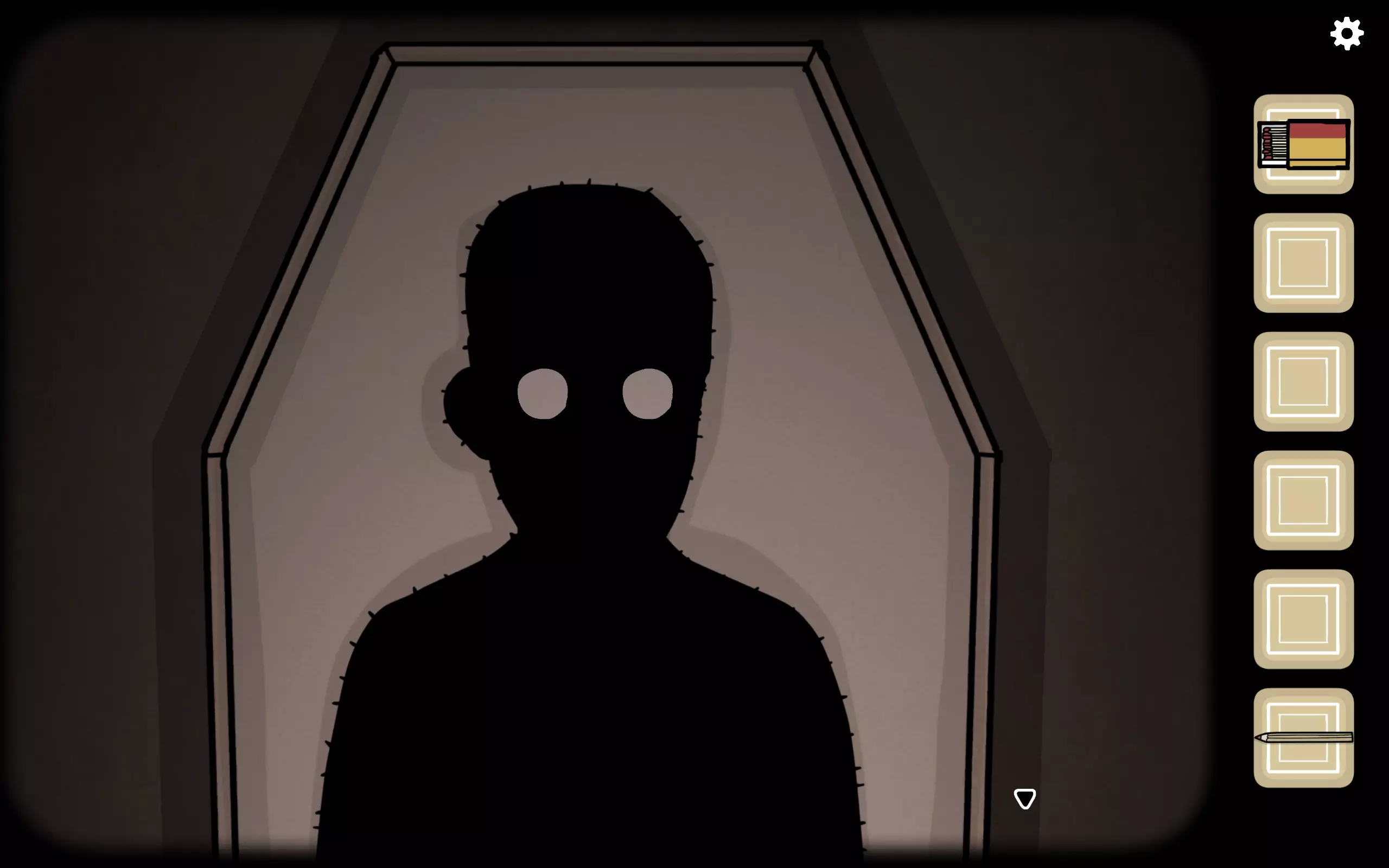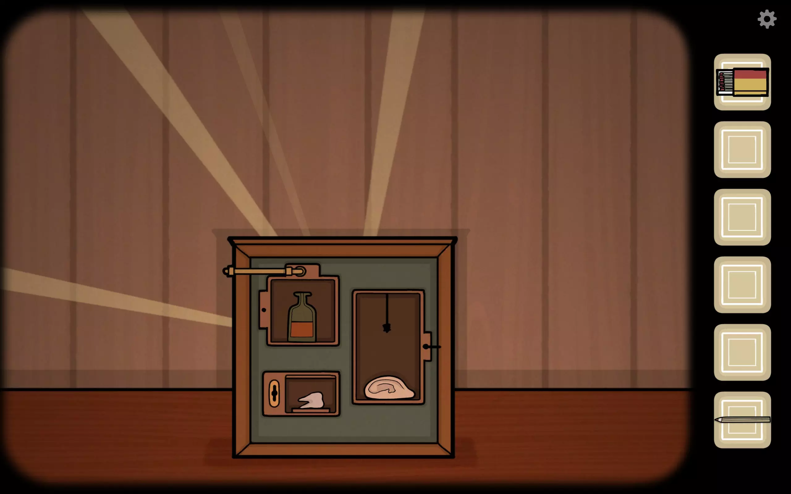 获得一个三角形块,放入之前柜子缺失的三角形槽中,即可打开柜子。三栏分别对应骨(牙齿)、血(鼻血)、肉(耳朵)。右上角可获得铅笔。