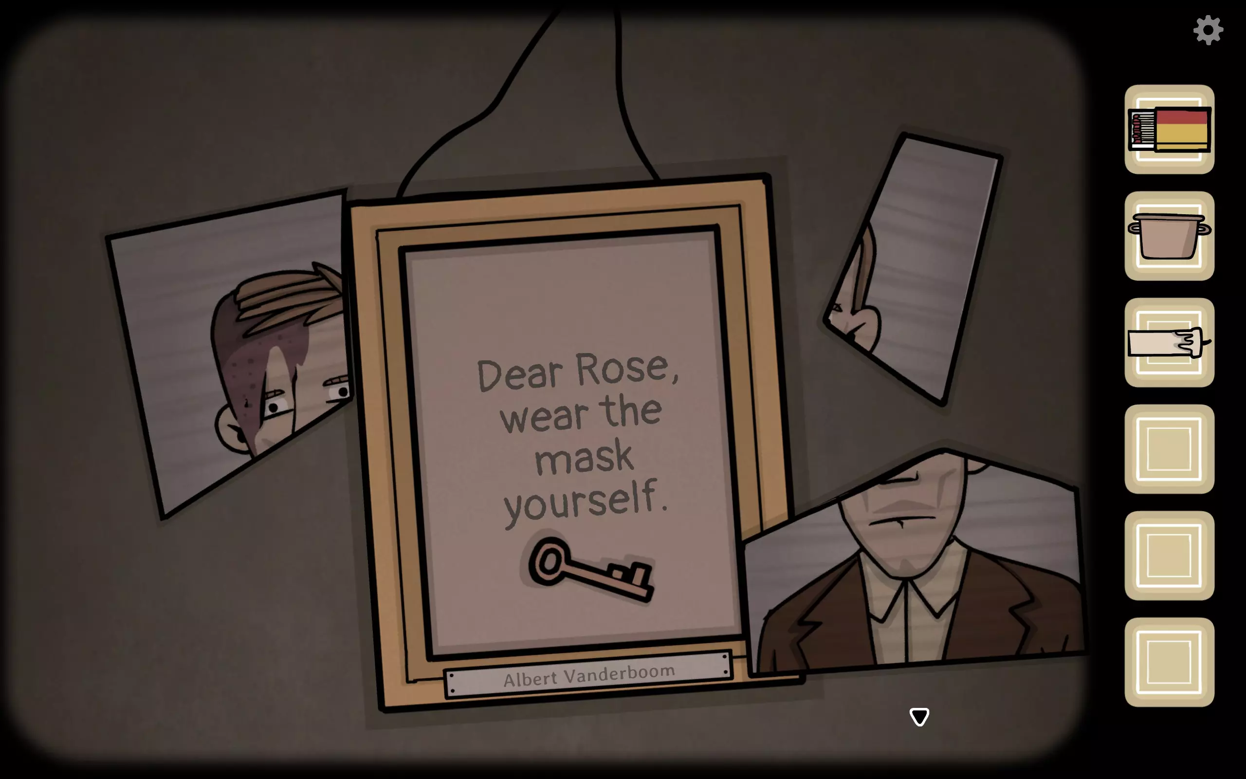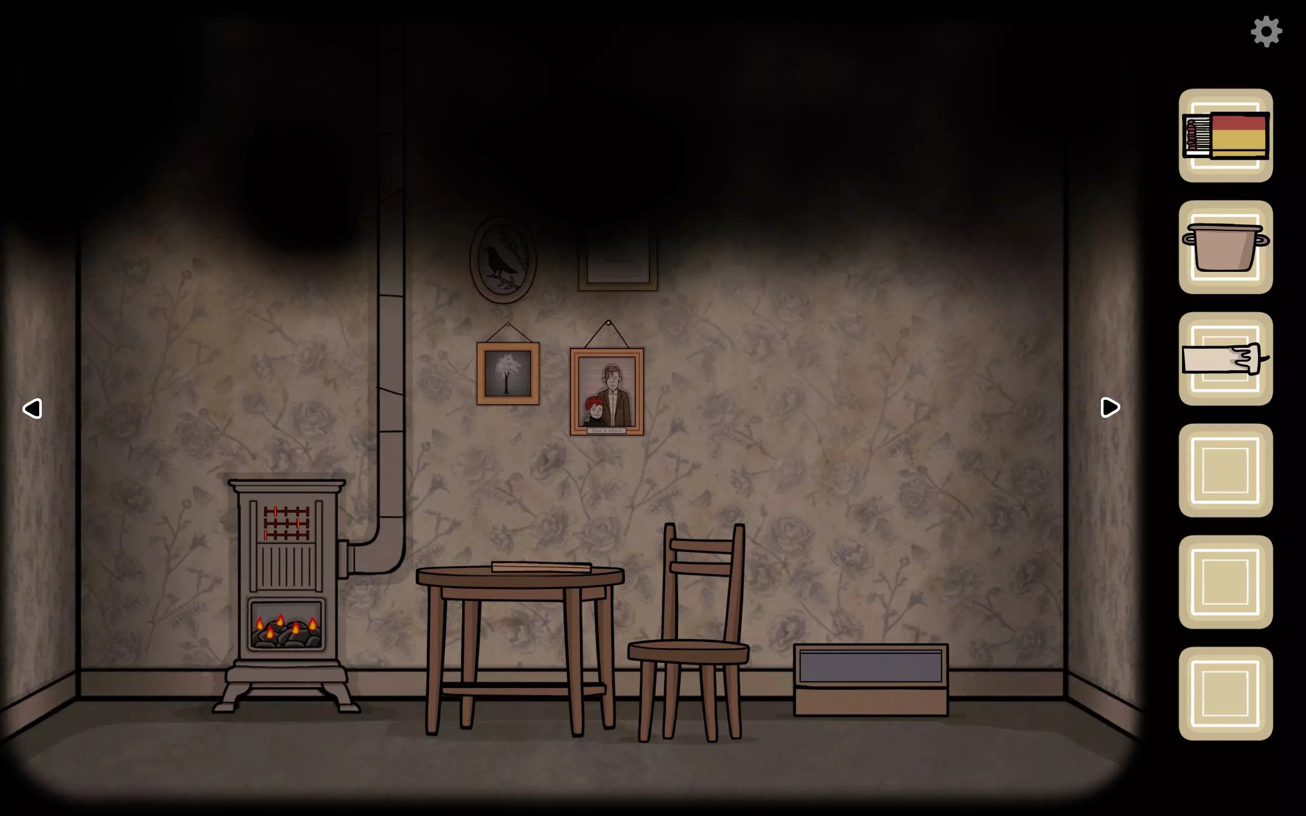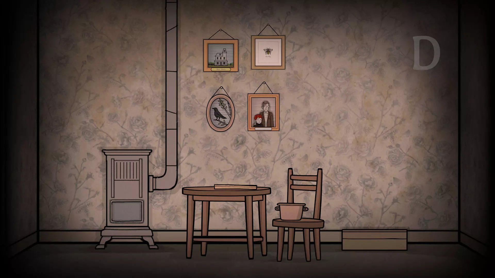 凳子上的锅可以先拿了 墙上四张照片分别对应【The Future】的四个图案:乌鸦、蝴蝶、树、合照 点击乌鸦照片,然后点一下乌鸦让它叫一声,返回看镜子,乌鸦哥出现(成就You know what to do,过去第五个成就)