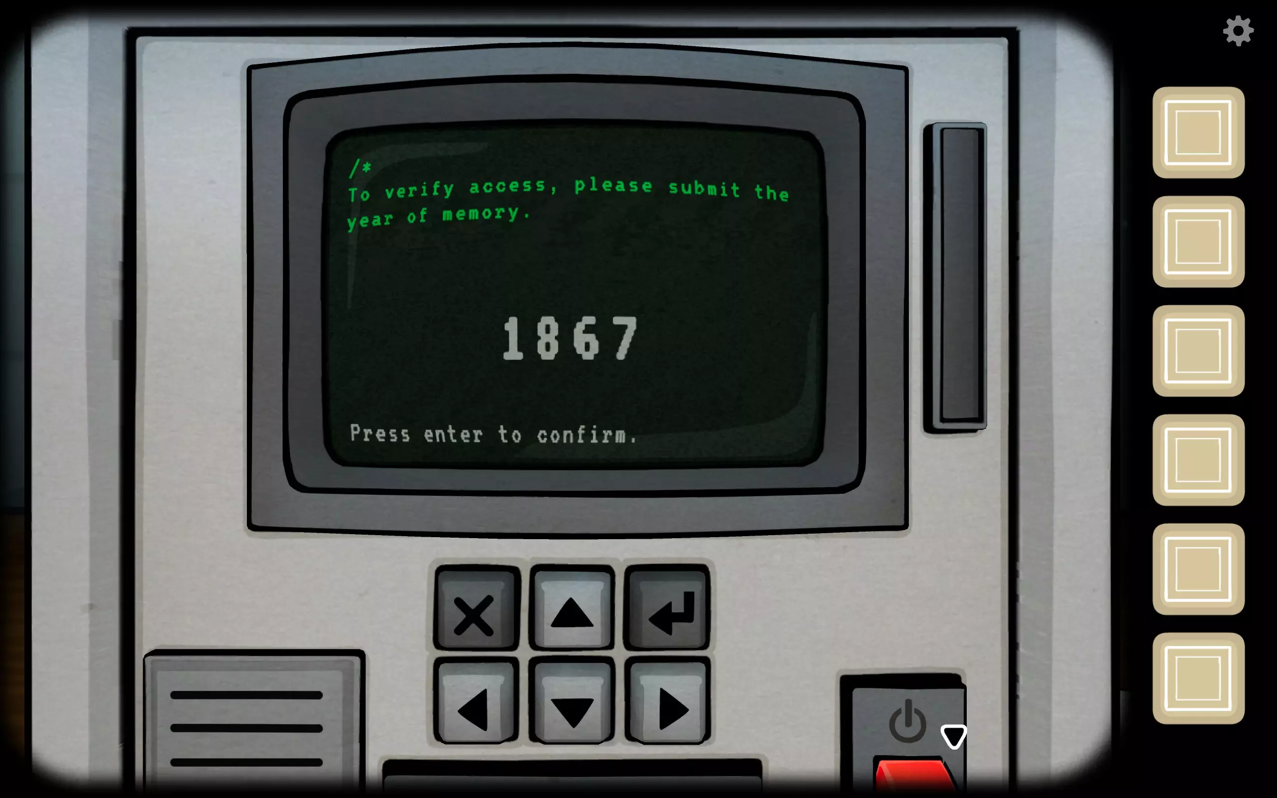 点击黄色向上箭头按钮弹出卷轴,点击并拉开,获得硬币。未来年份被下划线标注,为1984。