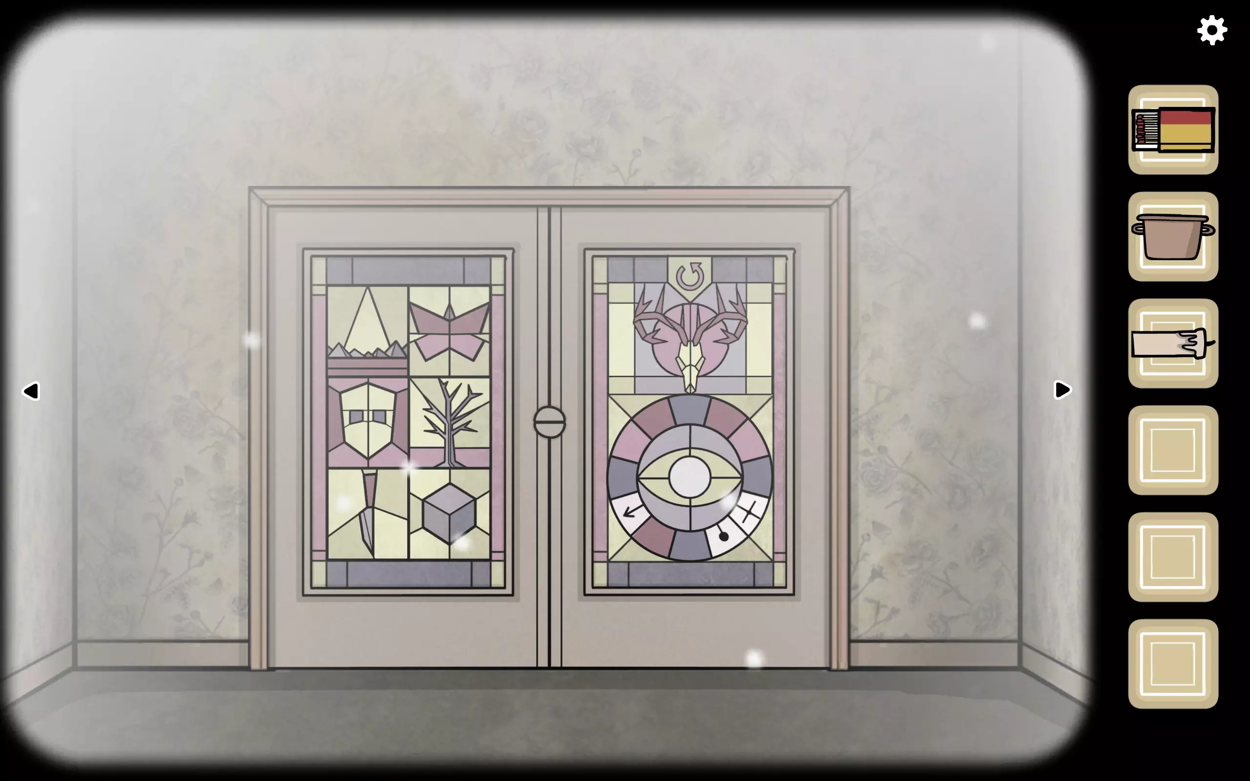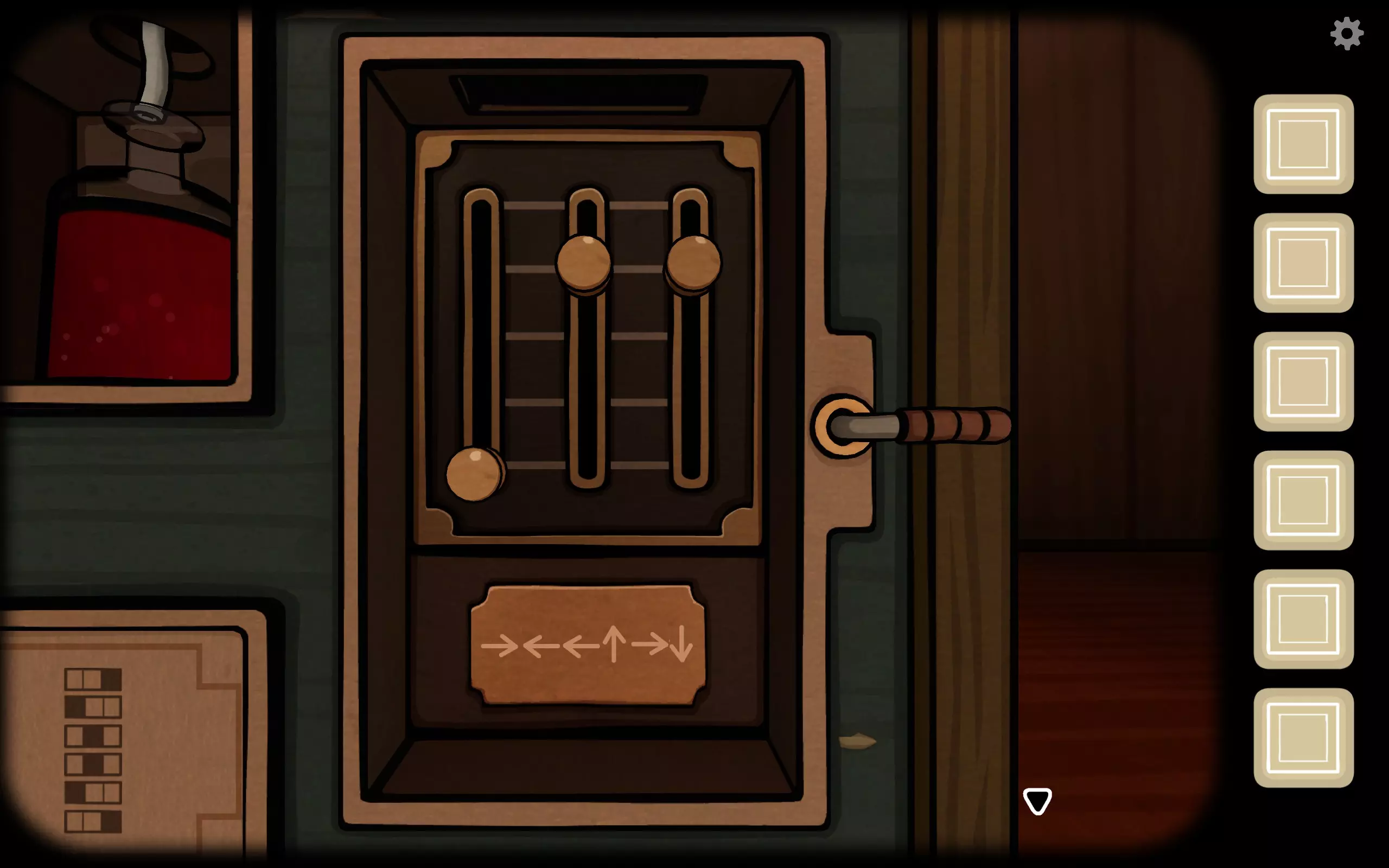 过去:报出三个指针的位置 未来:告诉变成白色的图案 过去:点击变成图案,然后三个指针会到新的位置 数次后门中间的锁会打开。 但是不要立马退出,此时指针位置过去一方记得告诉未来一方,未来玩家调整之后会继续从猫眼里会看到带着面具的罗斯,也就是过去的罗斯(成就Who is that?,未来第一个成就)