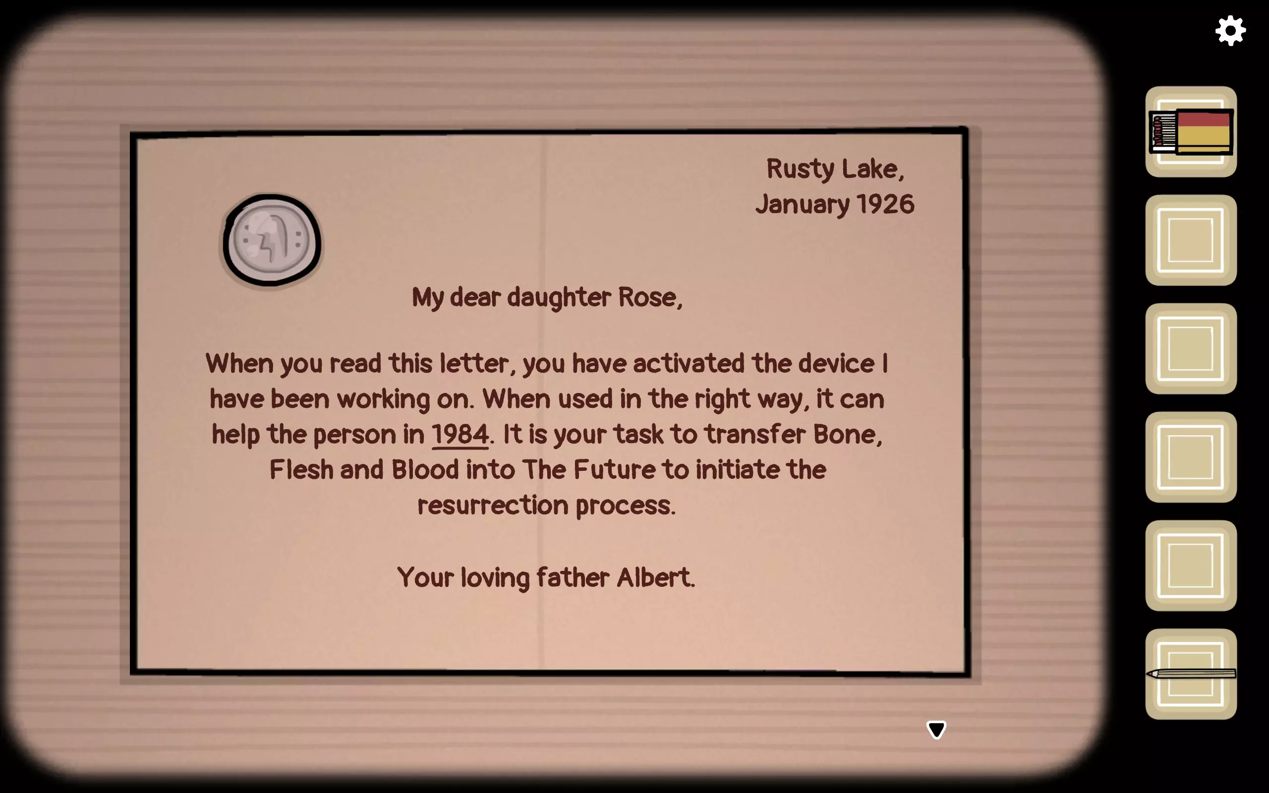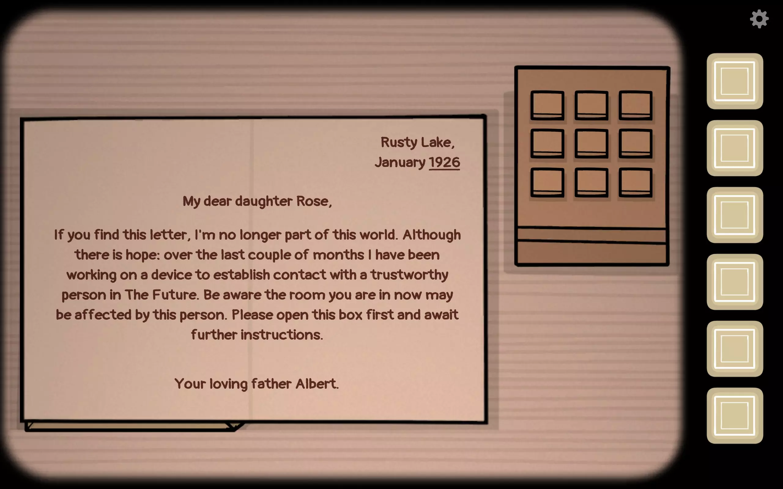 艾伯特在信中告诉罗丝,当她收到这封信时,他已经去世了,但他留下了一项黑科技。他让罗丝在无人窥视的房间里按照后续步骤操作。信的右上角写着1926年,这是过去的时间。右上角还有一个盒子,上面有九个可按下的按钮。 【未来】起始于一个箱子,打开右下角的开关后,会提示这个盒子储存着过去的记忆,需要进行链接并选择输入时间(持续按下盒子上的回车键即可)。根据过去的信可知,年份是1926。输入后按下盒子上的回车键确认,即可获得一个九宫格图案用于开箱。确认对方开箱后会掉落火柴盒,拉开火柴盒可获得一个旋钮。拖拽屏幕改变视角到左侧,放入旋钮并扭动开启,左侧会出现四个需要调整的图案。在“The Past”场景右上角的盒子中,根据对方描述的图案输入后会自动打开,可获得火柴盒【对应“The Future”场景获得的火柴盒】。退出后点击吊灯,打开可获得蜡烛,同时可以照照镜子欣赏Rose的美颜。