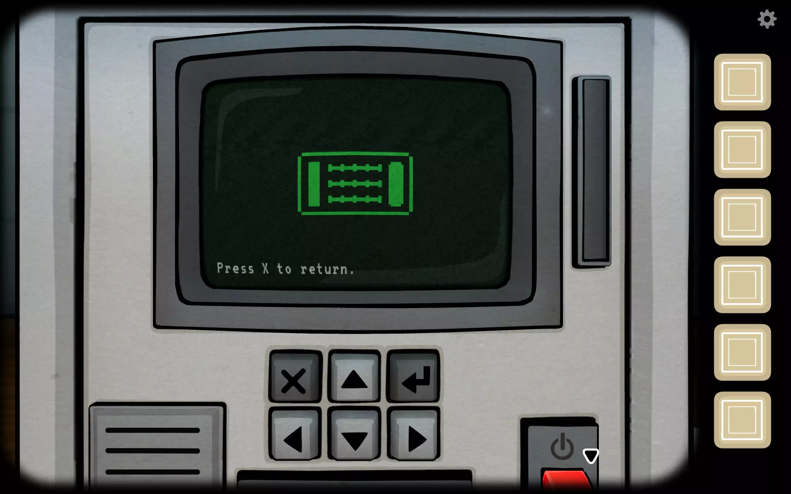 《过去与未来》未来:柜子中间有一台电脑,点击任意方向键会显示文字,确认如果找到全部隐藏齿轮就按屏幕上的↓键。屏幕此时会显示滑块的位置。过去:依据指示把耳朵那一格的三个滑块调到正确位置,下面会出现六个方向,告知对方。