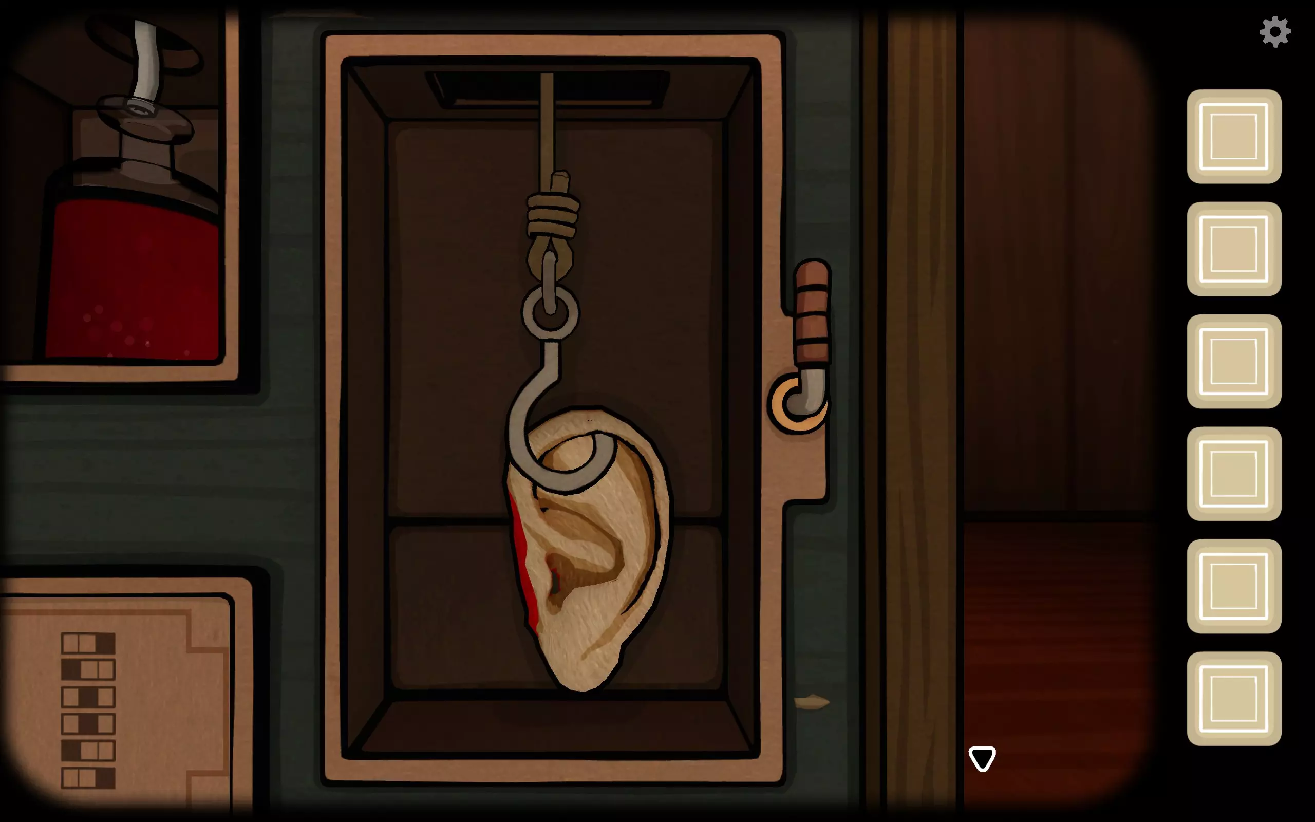 回到正面,将钩子挂到正面耳朵上方的铁环上,往下扳动旁边的扳手放下钩子,然后拉一次拉起耳朵,再拉一次拉出视线范围,获得成就The Ear on the inside,这是第七个成就。