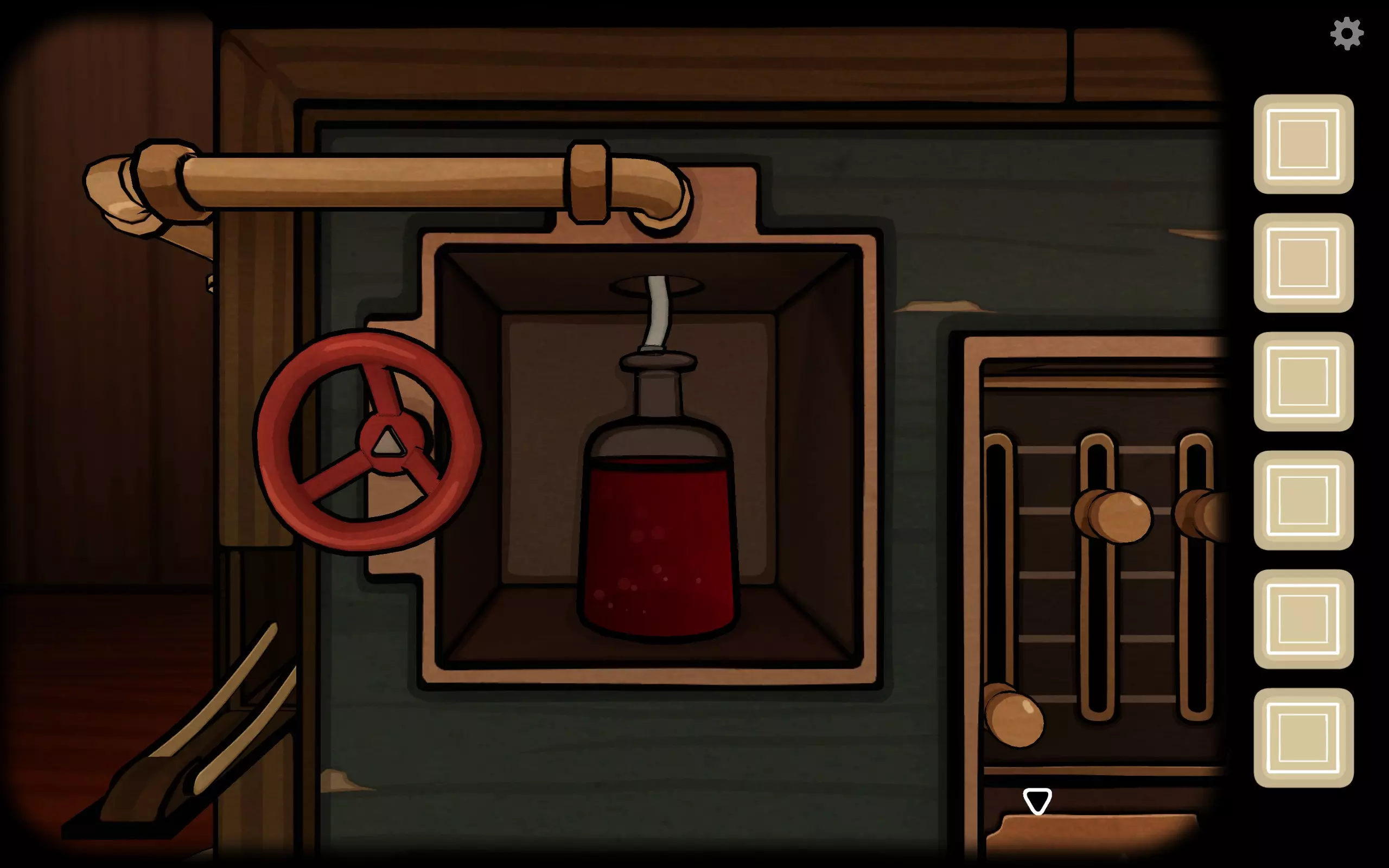未来:屏幕显示耳朵被放下来了。退出The Future,来到有水槽和镜子的地方,发现大耳朵。流程成就All ears是未来的第七个成就。用刀割下耳朵上的息肉。回到黑板和柜子一侧,按下右侧喷灯下方的按钮,然后用火柴点燃。放上水和咖啡,在左侧培养皿里放入息肉,屏幕出现指示3X2Z1Y。 第二章节 完全复活 The Past & The Future(此步骤存在随机部分,需根据自身情况操作) 未来:告知指示代码。 过去:在箱子右侧输入代码获得指示,需要添加液体到息肉上。如果是需要加热的液体,符号旁边会有放射状短线(共需添加三种液体)。加热时,将液体移到喷灯上使其沸腾,然后移到左边倒上去。未来:根据指示倒入相应的三种液体,然后屏幕出现新的代码,息肉会改变形态,告诉对方当前息肉是什么形态(倒了第一次之后是描述什么形状,第二次是描述上面有头发还是痘痘还是啥都没有,第三次是描述上面长了牙齿还是眼睛还是耳朵)。比较令人不适,大家忍一忍。结束后息肉会变成史莱姆,如果步骤完全没有错,那么会有成就Frankenstein,对应经典同名的“造人恐怖科幻小说”。未来第十个成就The Future。点击史莱姆跳离培养皿,然后爬出桌面,退出,它继续爬,停下来就点。右转至有大耳朵的那面,史莱姆会停在软管处,点击史莱姆使其进入。随后查看复活柜,会有灯闪烁。 将中间的黄色扳扭扳下,观察后按下旋钮,告知对方三个指针的新位置。 在The Past箱子右侧的猫眼处调整指针并查看。 退出后获得旋钮,将其放置在箱子正面左上角的三角形位置并旋转,左侧挡板会打开,出现闸门,拉下闸门后出现气泵。