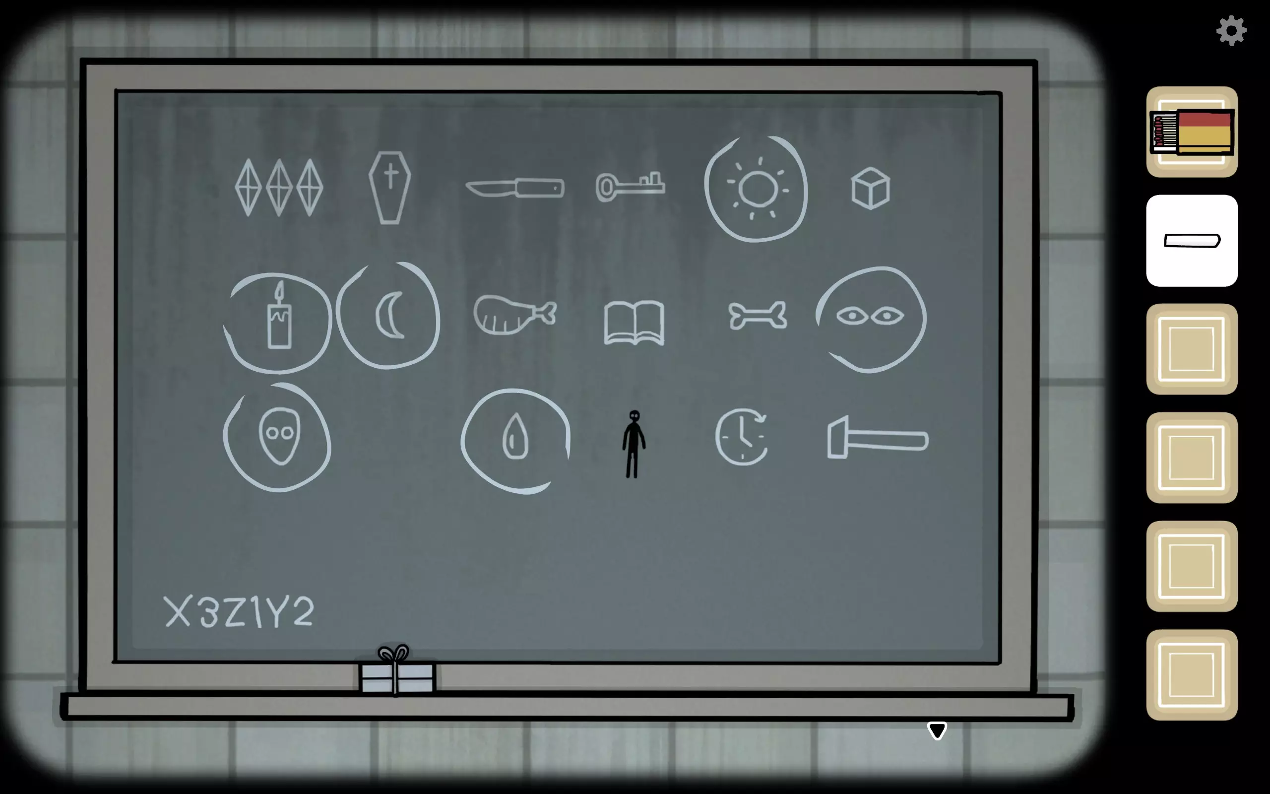 这是个字谜:我年轻时很高,年老时很矮。谜语人滚出哥谭 谜底是:蜡烛 1:15:40,左上角为O,方块内出现眼睛 1:19:55,方块内出现蜜蜂剧情结尾的开白花的树 整理可得: 血液X 月亮O 小刀X 日记X 太阳O 宝石X 锤子X 棺材X 卷轴O 未来X 钥匙X 面具O 方块X 血液O 血肉X 黑影X 骨头X 蜡烛O 眼睛O 以上均为【The Future】第二章黑板上出现的图标,推测X是错误选项,O是需要圈出来的 血液由于先X后O,最后认为需要O(反正都试一下,简单的穷举美学) 即需要圈:太阳,蜡烛,月亮,眼睛,面具,卷轴,血液,一共七个,全部圈选后卷轴图标晃动,点击即可获得卷轴