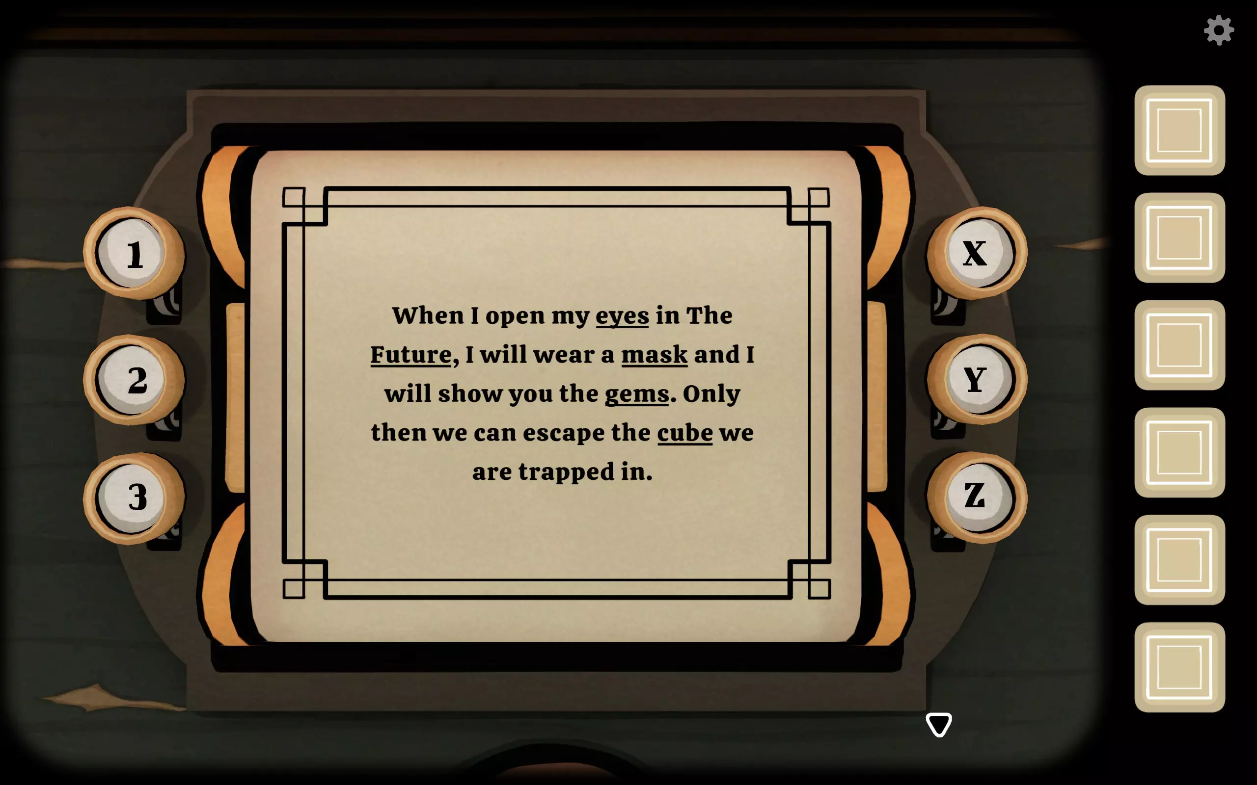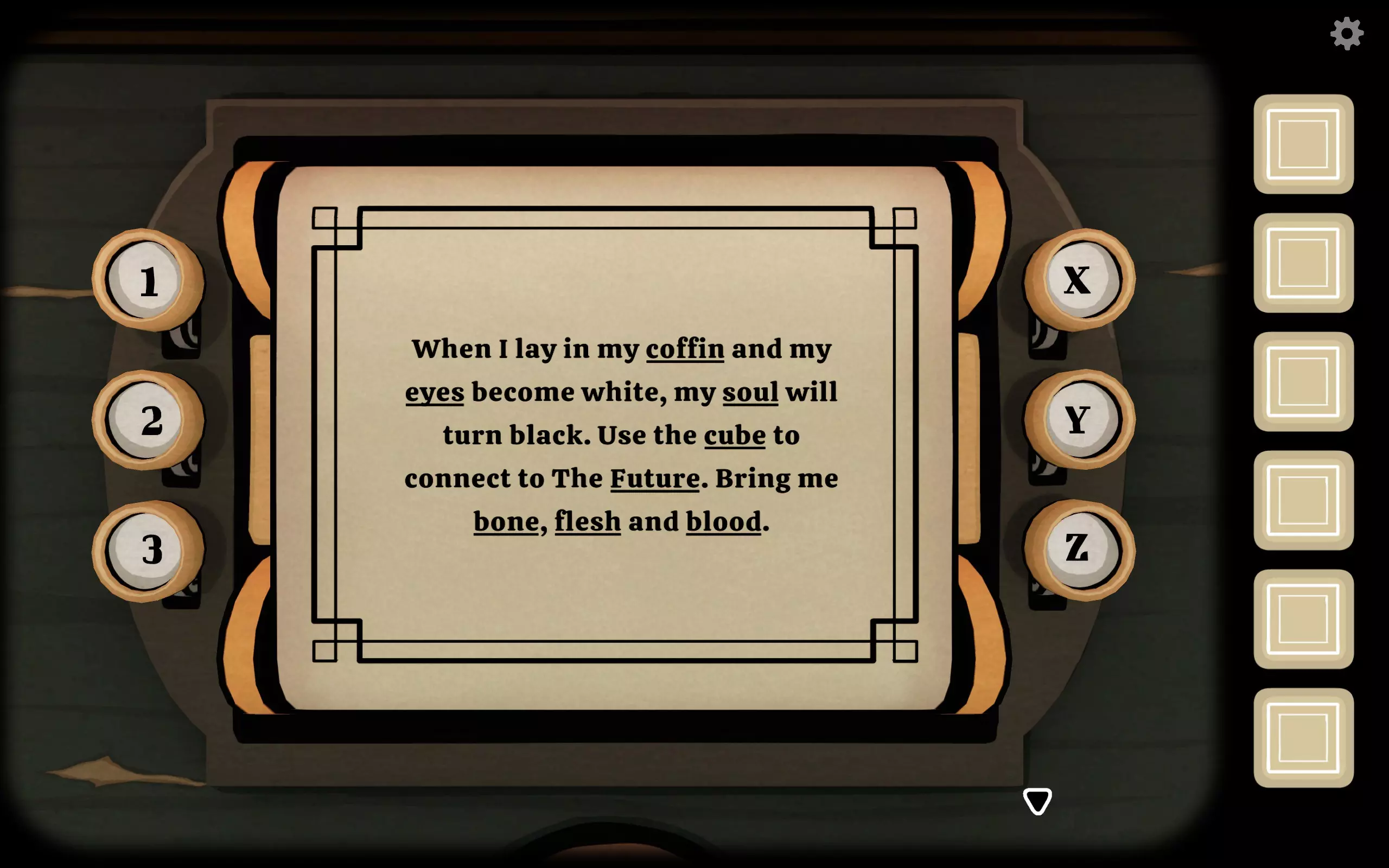 前往有大型黑色容器和类似排气柜的一侧,点击下方的栅板,然后根据指示调整滑块位置。 发现一颗大牙齿和粉笔。 回到柜子处,点击右上角黑板上的粉笔,会出现文字以及左下角的密码X3Z1Y2。 在过去场景输入密码X3Z1Y2,纸张滚动后出现文段,将画下划线的词告知对方。