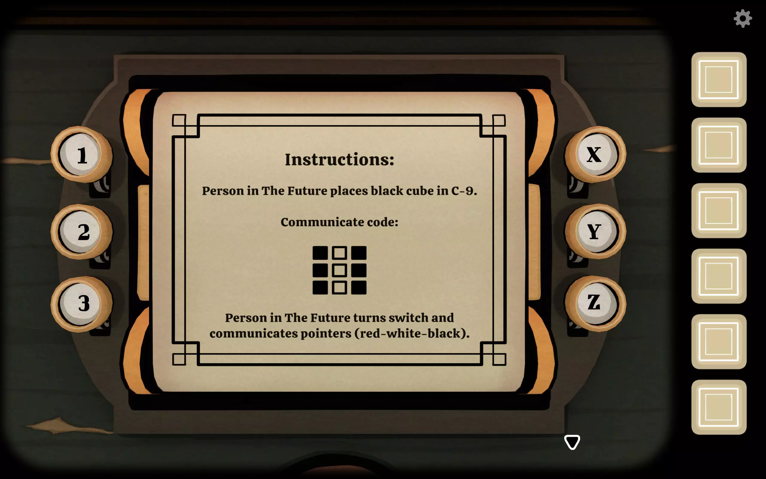 过去与未来(每次游玩后图案会有变化,请注意) 未来:复活柜上的黑色方块闪烁,点击观察,点击方块(小黑人飘过) 未来:告知对方方块内的物品 过去:拨动旁边的图案切换观察目标,直到符合对方描述的物品,然后把对应的九宫格图案告知对方 未来:方格旁边的九宫格按下图案,然后方块出现新的物品