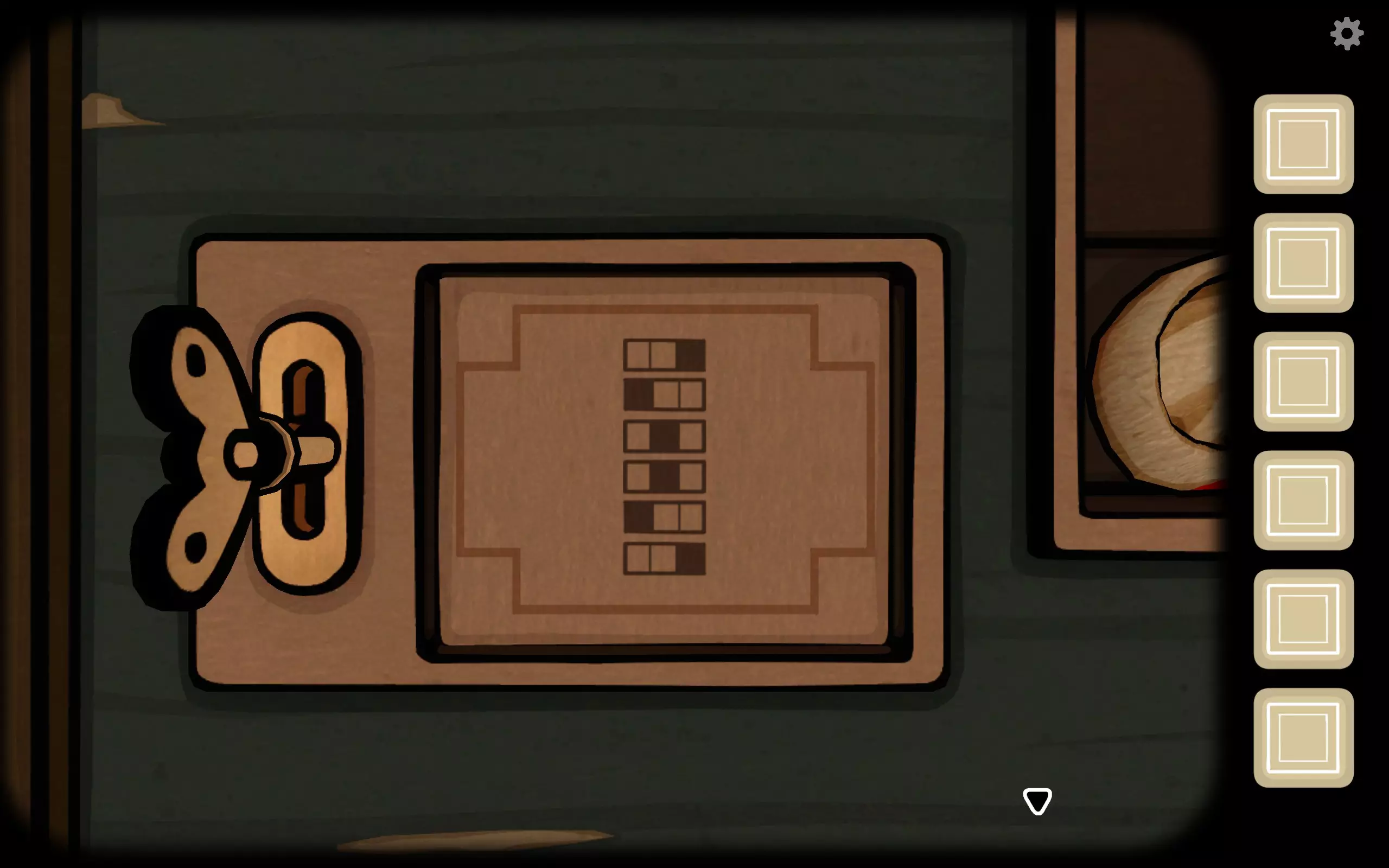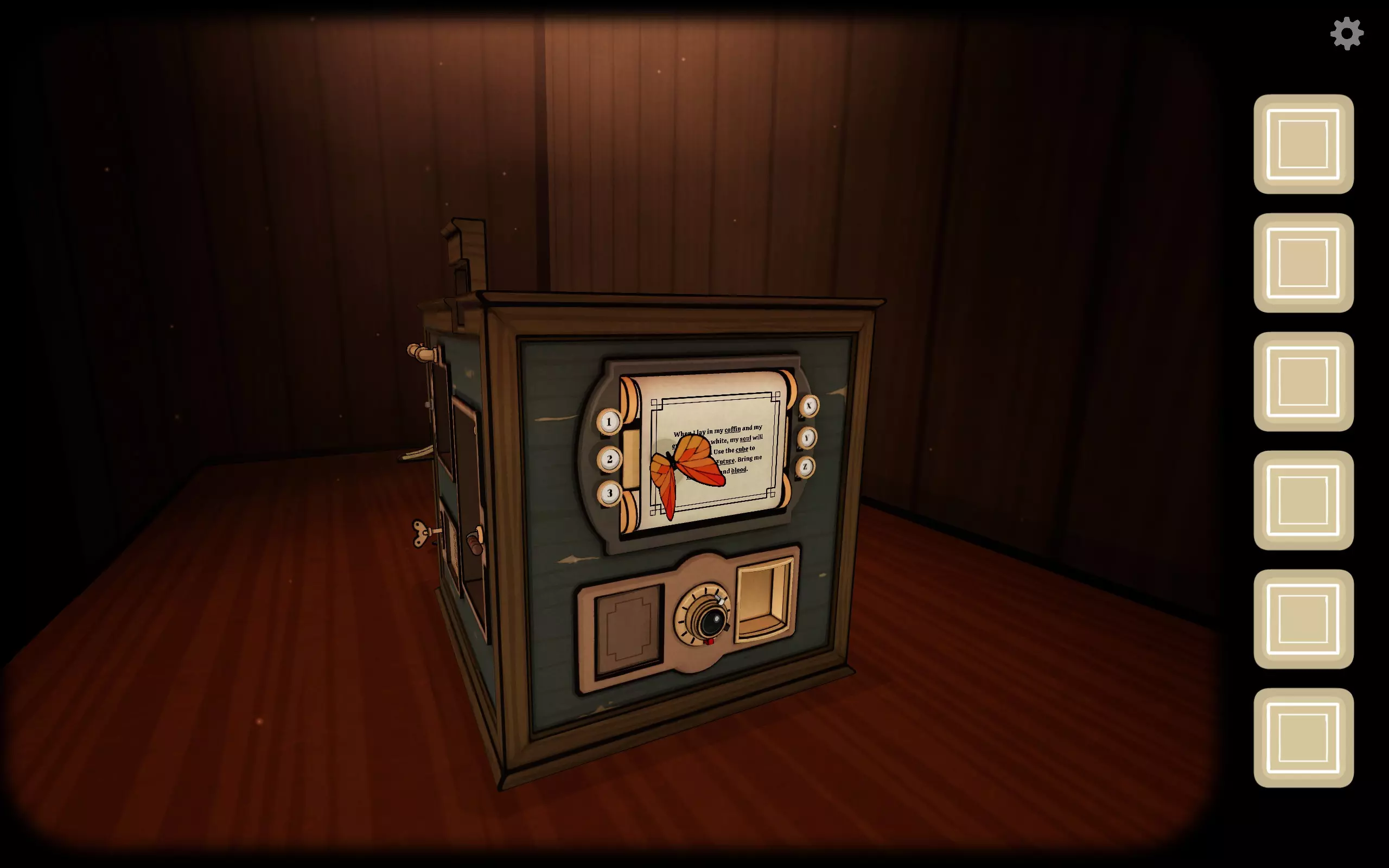 未来:根据屏幕指示,到箱子后侧,按照过去的提示,将滑块调整到正确位置,获得电池。 继续转到箱子右侧左下的排气扇,插入电池,此时显示时间17:15。 风扇吹开纸张,露出钥匙和幻灯片。风扇旁边的圆形挡板下方有一个插口,插入钥匙旋转打开,需要旋转三个标签,中间是一个猫眼。 过去:回到有镜子的一侧,那里有一个时钟,将时间调到17:15,风会进入房间(此时灯被风吹动,无法打开取出蜡烛)。
