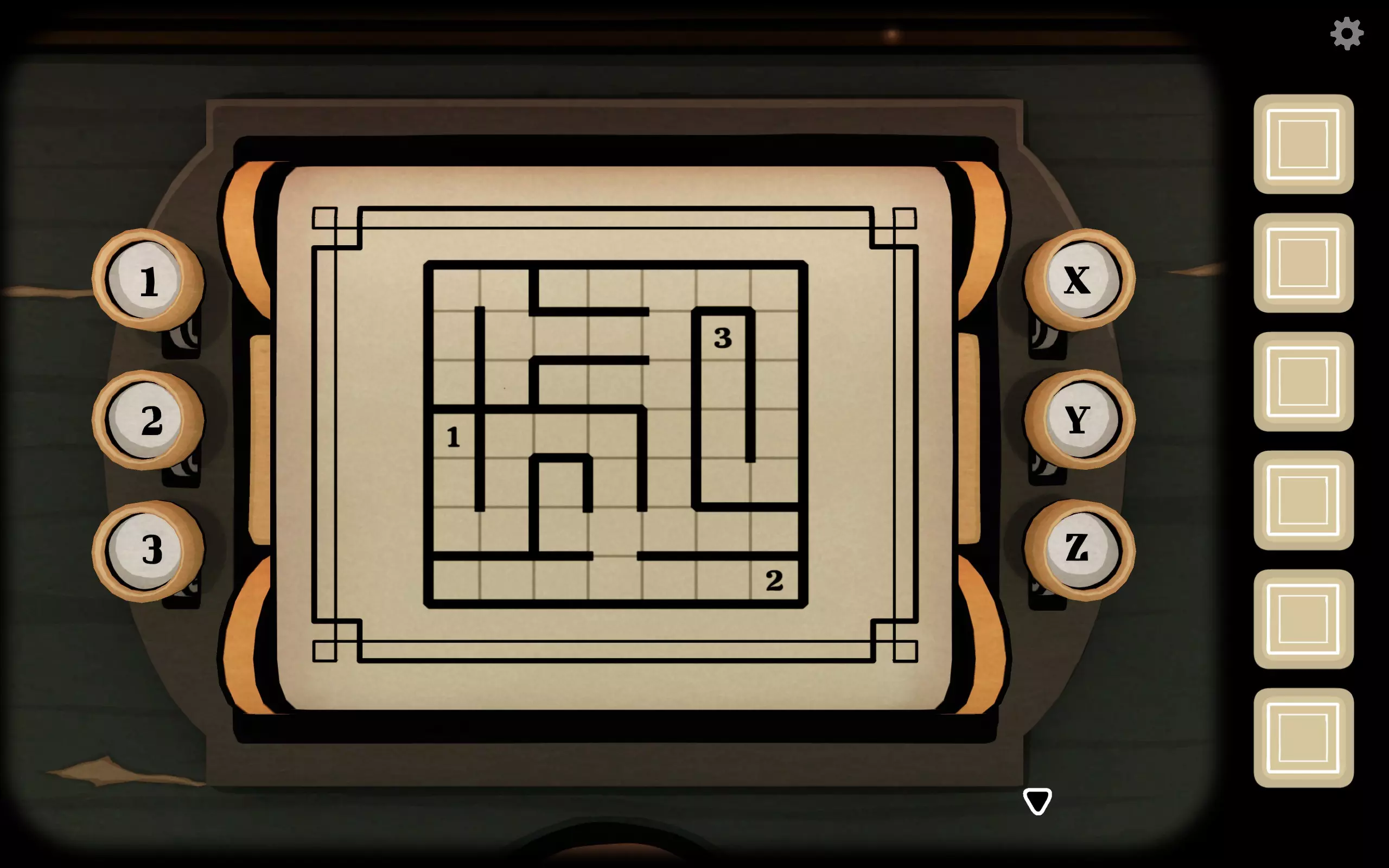 未来:根据指示按下方向键,屏幕出现一个7x7的格子图,以及左下角有密码Y3X1Z2。过去:在箱子右侧输入密码后出现一个迷宫以及三个数字,指挥未来方玩家将钩子移动到指定地点(顺序无关)。