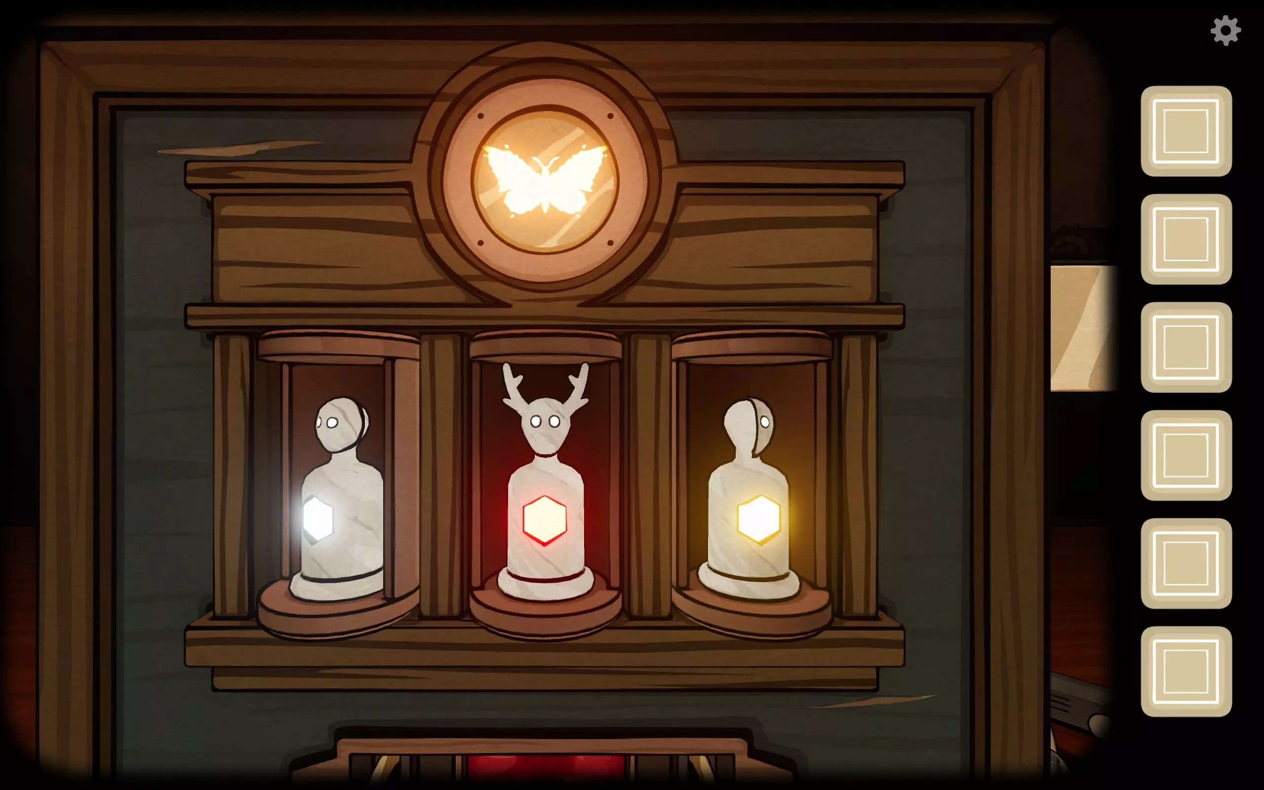 未来用粉笔在黑板上圈出听到的词汇对应的图案,然后得到钥匙。打开柜子里艾伯特的箱子,获得三个面具,找到艾伯特后,一个一个给他戴上。 未来:给艾伯特戴上音乐面具。查看收音机,显示新的字母。 过去:按照字母弹钢琴,获得第一个黄色宝石。 未来:给艾伯特换上鹿头面具。黑板显示新的滑块位置。 过去:将耳朵那格的滑块调到新位置,获得第二个红色宝石。