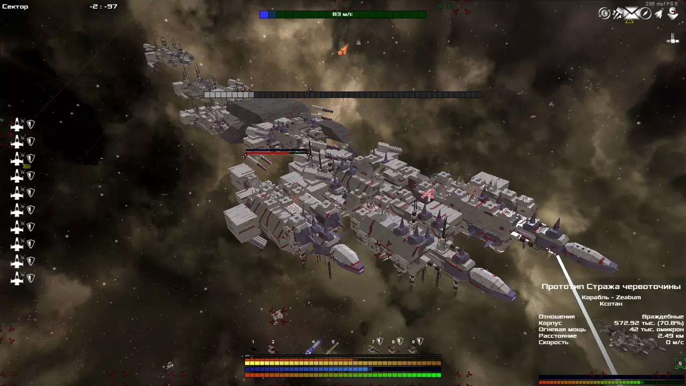 А как соберёте все ключи, активируйте портал и за барьер! Осталось совсем чуть-чуть... вот так, мягко сжимая и плавно, постепенно наращивая скорость и амплитуду движения руки... ой, я что-то увлекся, забудем об этом... Так вот... нужно найти треклятые восемь бааальших астероидов в скрытых масс-секторах. Таких секторов всего лишь несколько десятков, они находятся вплотную к барьеру или чуть поотдаль, по всему его периметру. Способ активации - корабль с артефактом разместить близко к астероиду с номером этого артефакта, при этом на конце "штанги" появляется свечение. Ну или сделайте большой плоский блин, повесьте на него все ключи и поставьте его между астероидами так, чтобы он касался их всех. После появления портала в ад барьерной чревоточины, из неё появится флот зотан с силой, примерно, в два зотанских рейда и с двумя мазершипами в придачу. Изначально они не враждебны и проходу за Барьер не мешают. Если в случае боестолкновения вы потеряли корабли с артефактами, их можно восстановить в Ремонтном Доке (но на сложностях "Хардкор" и "Безумие" плакали ваши корабли и их внутренности). В одиночной игре, при перезаходе на сервер, чревоточина пропадает, но её можно заново активировать. В многопользовательской она тоже пропадает, но только через некоторое, весьма продолжительное время. Итак, с ключами на этом всё! Далее вы сможете узнать о "держателях" ключей и прочих бандитах, то бишь о сюжетных и внесюжетных боссах, а также разные тактики борьбы с ними. От винта! Фантастические боссы - где они обитают и с чем их кушац. Enemies of the Emperium, hear me! You have come here to die. The immortal Emperor is with us and we are invincible. His soldiers will strike you down. His warmachiens will crush you under their treads. His mighty guns bring the very sky crashing down opon you. So, make yourselves ready, you cannot win. У фантастических боссов имеются свои нечеловеческие слабости и запрещенные приемы (хотя большинство боссов является натуральными редисками, которых для вида накачали химией), о которых и будет рассказ. Скажем так... Добарьерных сюжетных боссов с артефактами восемь, четыре из них делят один артефакт, плюс еще один сюжетный террорист в центре, плюс внесюжетных имбовых еще несколько (а технически, очень многа, если учесть каждый кусочек от каждой из трех форм ИИ), а если установите дополнение Черный Рынок, то, помимо мазершипов пиратов и охоты на мини-боссов за вознаграждение, вы получите удовольствие мочить еще много и много боссов. У почти всех из них есть небольшая предыстория (вот это поворот!). Про ареал обитания добарьерных написано выше, в артефактах, а здесь будет инфа лишь про их вонючие посудины, про разные пути их нагибания, а также про стволы и вкусняшки, которые падают с них. Форма корпуса, хп и щиты, дамаг и скорость меняются в зависимости от расстояния от центра Галактики и по воле Великого Рандома (ваш капитан Очевидность), но у ИИ, у Стражей и прочих подобных уродов корпус остаётся, как правило, одинаково странным, как постройки школьника в Майнкрафте, а Фиджет часто попадается с огонитом даже в самом углу карты. И это еще не единственные странности в игре. Кроме того, основных сюжетных боссов нельзя брать на абордаж, впрочем, ладно... Внимание! Дальнейшие тесты проводились авторами статьи в обычной игре на разных сложностях и версиях игры. В вашей галактике значения могут быть другими, мы не претендуем на абсолютную точность, так как нет времени копаться в коде иг
