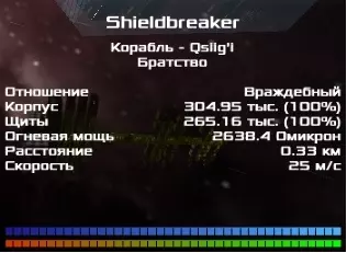 护盾:25万 - 27万 船体:22万 - 30万 奥米茄值:3600 - 4750单位 武器:机枪(9公里)约50%,射线枪(7公里)约50% 速度:约250 - 3050米/秒 只有在你的护盾消失时才是强大的敌人。除此之外并无特别之处。 破盾者