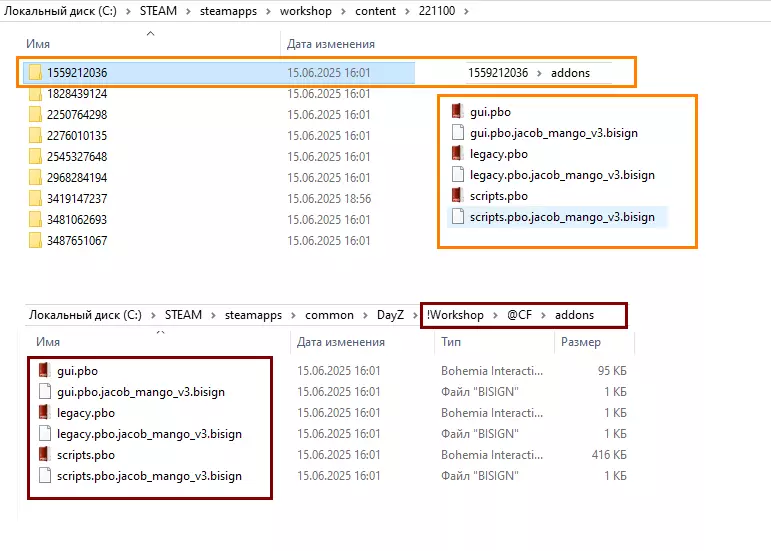 比较!Workshop和workshop的内容,可以发现它们是同一个模组。 如果在DayZ文件夹中无法看到!Workshop文件夹(可能是隐藏项目),可能需要从此处复制带有模组编号的文件夹内容(包括.pbo、.bisign和.bikey文件),然后在服务器中手动将模组编号重命名为@文件夹形式的模组名称,同时保持【@模组-插件-密钥】的结构。之前是: [1559212036] - [addons] - [keys] 已正确重命名为: [@CF] - [addons] - [keys] 对SLP模组也照此操作 将3487651067重命名为: [@DayZ Single Local Player] - [addons] - [KEY] 别忘了之后将[@CF]-[keys]和[@DayZ Single Local Player]-[KEY]的文件(.bikey)放入服务器文件夹[keys]中。