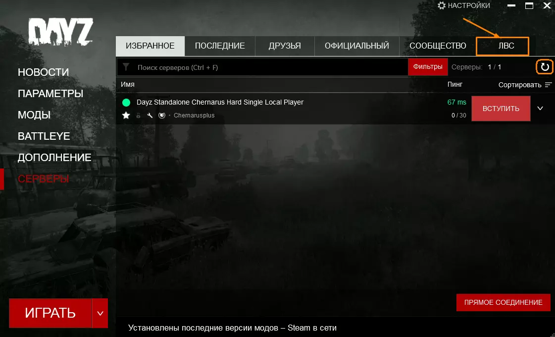 使用固态硬盘时,我的加载过程只需1-2分钟。 *作为对比,使用机械硬盘时,服务器启动需要20-25分钟…… *如果没有出现【IdleMode】Entering IN - save processed - 该怎么办? 您可以参考服务器推荐设置 [4]……好了,该开始游戏了,打开DayZ,选择“标准启动器” [服务器]→【LVS】标签页 看不到?别慌!刷新页面或重启游戏启动器。我有时得重启5次,这取决于电脑、网络或路由器的情况。