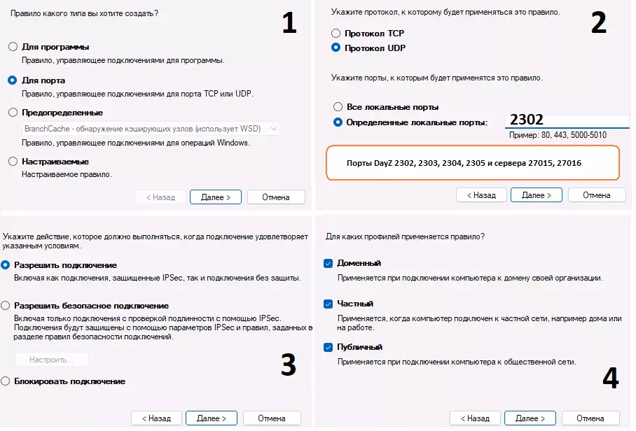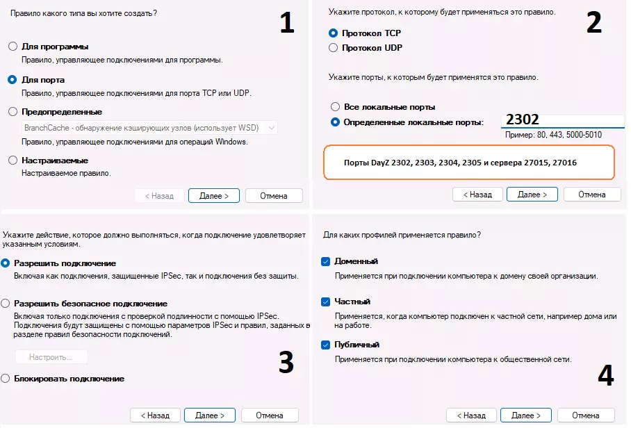 名称 = [ВходящийDayzTCP2302] 或 [IN_Dayz_TCP_2302],这里没有区别,怎么方便怎么来,哪怕把所有24条规则都命名为[DayZport],但为了避免混淆,我认为保持结构更方便。 描述 - 非必需。 完成 = 点击完成。 实际上,它看起来是这样的: