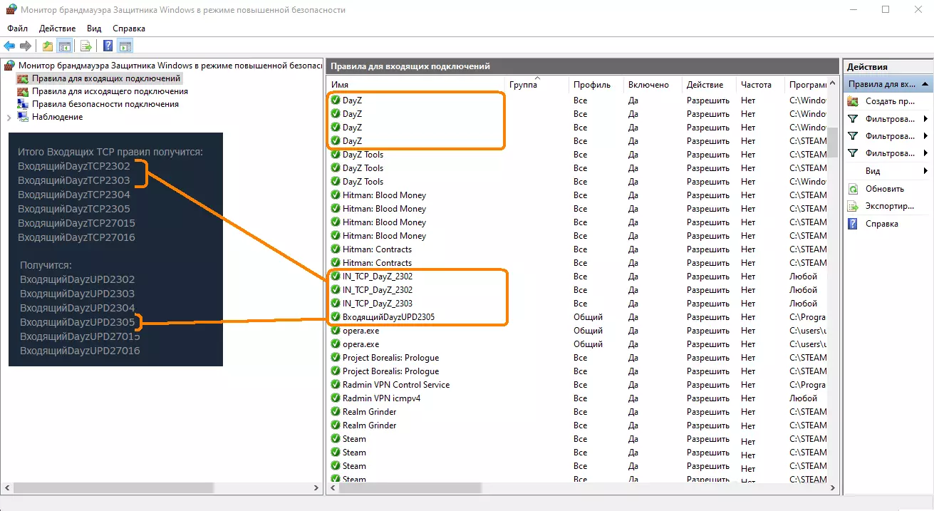 🔊 Важно Если путь содержит Кириллицу, папку Program Files или содержит пробел: Например: C: Program Files (x86) Steam steamapps common DayZ_Standalone_SLP D: Мои игры NEW STEAM steamapps common DayZ_Standalone_SLP F: Games PC game steam steamapps common DayZ_Standalone_SLP Тогда перенесите сервер [DayZ_Standalone_SLP] напрямую на диск D: ..C: .. F: ... и так далее. Пропишите путь так: serverLocation="D: DayZ_Standalone_SLP" "-BEpath=D: DayZ_Standalone_SLP battleye" "-profiles=D: DayZ_Standalone_SLP profiles" [9] Локальная сеть и Radmin vpn(или Hamachi vpn, но я работала только с Radmin) Для игры с другом Вам и Другу требуется Скачать Установить Radmin vpn Создать Имя сети и Пароль, скинуть Имя и Пароль другу, он должен подключиться к вашей сети Radmin и появиться как "новый контакт" под этой сетью. Этот же IP Radmin вы будете использовать для поиска сервера в "Стандартном Лаунчере" закладка [ЛВС] или [Прямое соединение] + порт консоли сервера 2302 или 2303, 2304, 2305, 27015, 27016. [10] Кстати о портах..Возможно для игры с друзьями потребуется открыть порты в Брандмауэре Windows для DayZ Почему возможно? Тут в ступает в силу воля рандома сетей, провайдера, компьютера, роутеров и еще только Богам известно чего... У кого-то работает без настроек, у кого-то только с ними. А вот если Брандмауэр не помог, сервер вы друг все еще не видите, тогда нужно открывать порты ЕЩЕ и в РОУТЕРЕ. С роутером все индивидуально и от провайдера зависит. Тут не подскажу, мне это не понадобилось. Гуглите свою модель, пробуйте... настраивайте... Открываем порты: [Открываем Брандмауэр] Windows – [Дополнительные параметры] Правила для [ВХОДЯЩИХ] и [ИСХОДЯЩИХ подключений] Начинаем для [ВХОДЯЩИХ]: [Создать правило] [ • ] – [Для порта] для Протокола [TCP] [ • ] – [Определенные локальные порты] (сюда пишем первый порт из списка 2302, 2303, 2304, 2305, 27015, 27016) [2302] [ • ] – Разрешить подключение [ • ] – [Доменный/Частный/Публичный] (по умолчанию должны стоять) Имя, любое. Разницы нет никакой. Хоть одно и тоже имя пишите [DayZport] Просто структурировать [ВходящийDayzTCP2302] или [IN_Dayz_TCP_2302] - вам же визуально удобнее будет. Имя = сохранили. Описание = не обязательно. Закончили = Готово. Повторить все [TCP] еще для 2303, 2304, 2305, 27015, 27016 Итого ВХОДЯЩИХ правил получится: ВходящийDayzTCP2302 ВходящийDayzTCP2303 ВходящийDayzTCP2304 ВходящийDayzTCP2305 ВходящийDayzTCP27015 ВходящийDayzTCP27016 Дальше, все тоже самое, для протокола [UPD] Получится: ВходящийDayzUPD2302 ВходящийDayzUPD2303 ВходящийDayzUPD2304 ВходящийDayzUPD2305 ВходящийDayzUPD27015 ВходящийDayzUPD27016 Далее все тоже самое для ИСХОДЯЩИХ правил [TCP] портов 2302, 2303, 2304, 2305, 27015, 27016 и потом для протокола [UPD] портов 2302, 2303, 2304, 2305, 27015, 27016 Получится для [TCP] ИсходящийDayzTCP2302 ИсходящийDayzTCP2303 ИсходящийDayzTCP2304 ИсходящийDayzTCP2305 ИсходящийDayzTCP27015 ИсходящийDayzTCP27016 ...для [UPD] ИсходящийDayzUPD2302 ИсходящийDayzUPD2303 ИсходящийDayzUPD2304 ИсходящийDayzUPD2305 ИсходящийDayzUPD27015 ИсходящийDayzUPD27016 Ок. Перезагружаем ПК! [11] Алгоритм для игры:Включаем ПК Заходим в Steam *Radmin vpn тоже должен быть включен! [12] Запускайте один из файлов своих start.batЖдем загрузку серверной консоли до надписи: [IdleMode] Entering IN - save processed Если [IdleMode] Entering IN - save processed - не появляется? Вам сюда ===> Рекомендации по серверу *с SSD грузит за 1-2 минуты, с HDD 20-30 минут [13] Открываем SteamЗапускаем DayZ Открываем в "Стандартном Лаунчере": [Серверы] ==> [ЛВС] или подключаемся [Прямое соединение] IP Radmin vpn+ [ порт ] из консоли сервера 🔊 Важно Не отобразился или не виден сервер? Кнопка [Обновить] Обычно для решения хватает перезапуска DayZ, не выходя из Steam Бывало я по 5 раз перезапускала DayZ Лаунчер, не впадайте на этом этапе сразу в панику, что все сломалось! 🔊 