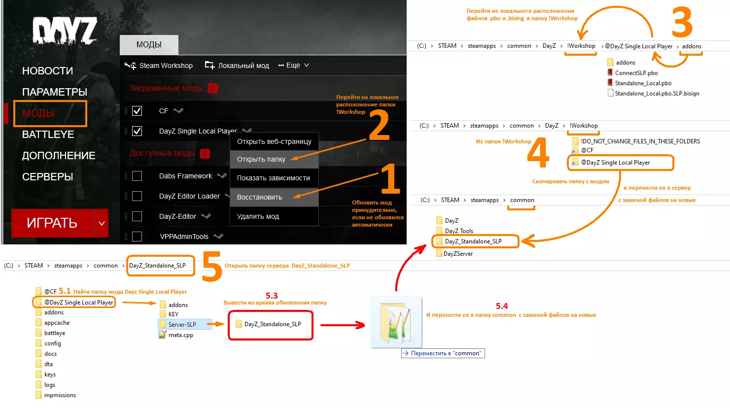 - 打开启动器。 - 通过【恢复】进行更新。 - 打开模组的本地位置,即【!Workshop】文件夹。 - 复制整个模组文件夹。 - 将模组文件夹移动到服务器文件夹【DayZ_Standalone_SLP】并替换文件。 1) - 打开服务器【DayZ_Standalone_SLP】,在服务器中打开模组文件夹【@DayZ_Single_Local_Player】。 2) - 在模组文件夹【@DayZ_Single_Local_Player】中找到【Server-SLP】文件夹,其中包含更新压缩包。3. 将更新版本文件夹【DayZ_Standalone_SLP】从压缩包中解压出来,并将其移动到服务器所在位置,以替换文件的方式完成【DayZ_Standalone_SLP】的更新。 如果更新说明中要求,需进行数据清理。 按照单人或与好友游玩的常规流程进行游戏。 如何更新@CF: 与更新SLP的操作完全相同,只是无需对服务器进行更改,仅更新模组本身。