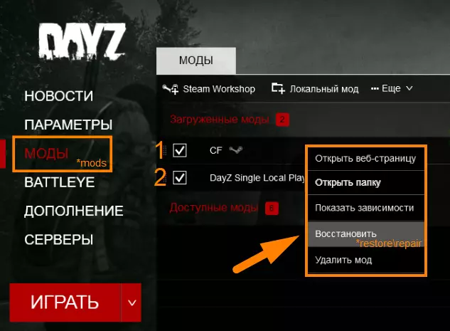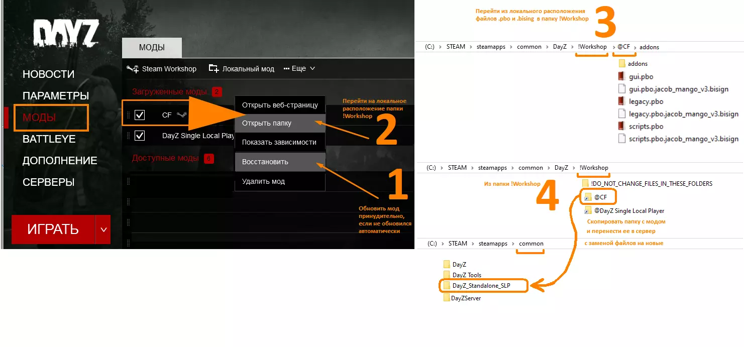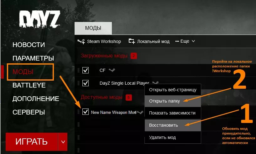 - 打开启动器。 - 通过【恢复】功能进行更新。 - 打开模组的本地位置,即【!Workshop】文件夹。 - 复制整个模组文件夹(完整复制文件夹)。 - 将模组文件夹移动到服务器文件夹【DayZ_Standalone_SLP】中并替换文件。 *CF和SLP密钥在首次设置服务器时已转移,因此无需更新,但如果作者更新了密钥,只需将其移动到服务器的【key】文件夹中。以单人或与好友的常规模式进行游戏。 如何添加新【模组】: 通过新模组可以让游戏更加有趣、多样且舒适。为方便起见,在SLP模组主页面的主题中创建了讨论区,你可以在那里分享你觉得有趣或推荐安装到本地服务器的模组相关内容。原则上,添加模组并不困难——前提是你已经了解搭建SLP服务器所基于的基础模组更新方式。 操作步骤与你熟悉的以下内容的操作相同:“从!Workshop转移addons和key” @CF @DayZ Single Local Player 开始操作 打开STEAM DayZ ==> 社区中心 创意工坊 ==> 例如【New Name Weapon Mod】
