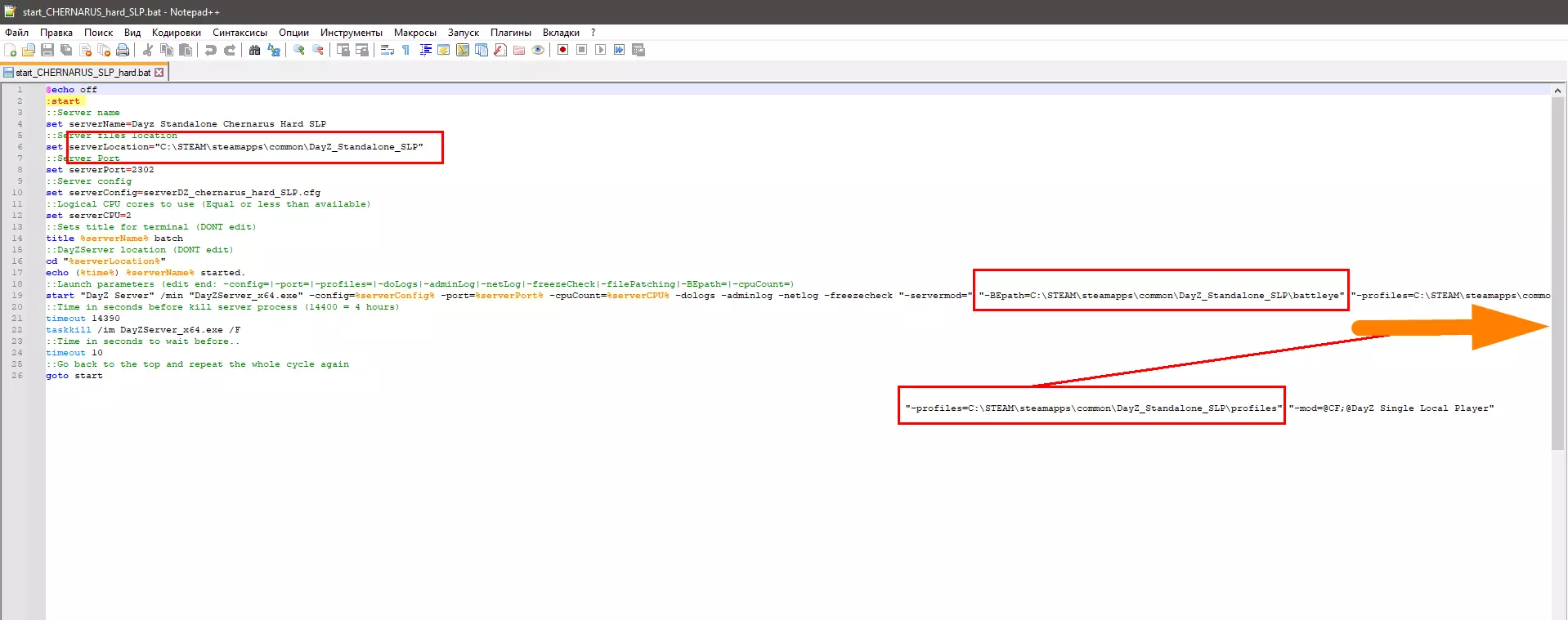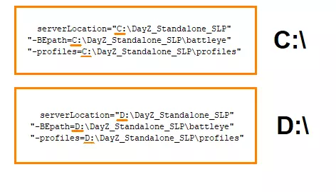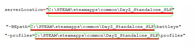 并在.bat文件中按如下方式写入路径: serverLocation="C: DayZ_Standalone_SLP" "-BEpath=C: DayZ_Standalone_SLP battleye" "-profiles=C: DayZ_Standalone_SLP profiles"