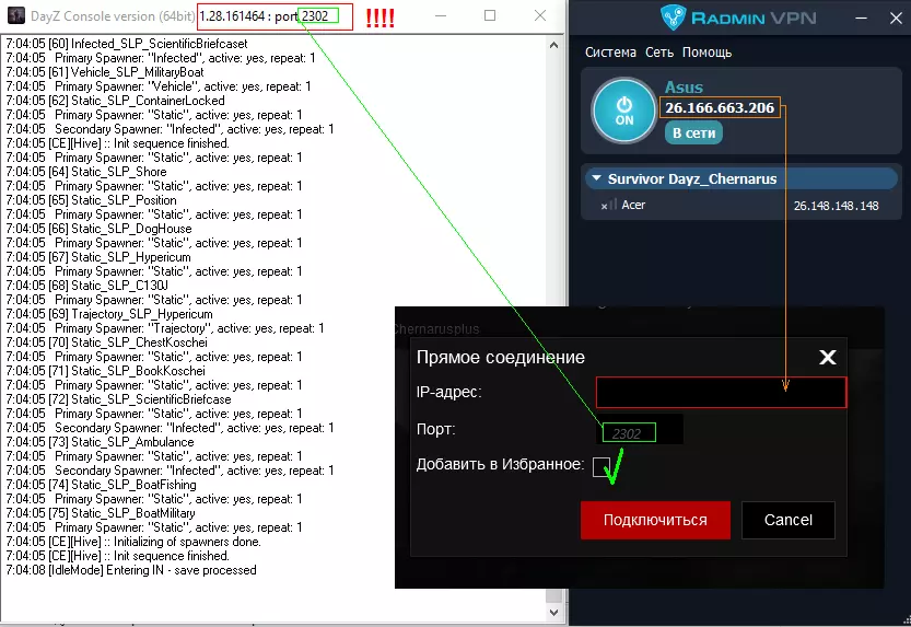 重要提示 与朋友一起游戏时,你和朋友都需要开启Radmin vpn。 请注意检查Radmin vpn是否已关闭或未设置为开机启动。 重要提示!! 请注意! 用于【直接连接服务器】的服务器控制台数字(小窗口+[端口: 2302])和Radmin vpn网络并非不同的IP。 不要混淆! 控制台中显示的是DayZServer的版本(服务器1.28.161464)并且仅此而已:端口 *我不会随着游戏的每个版本更新截图,所以今后这里会是1.29版本……1.30版本……161465版本……等等诸如此类
