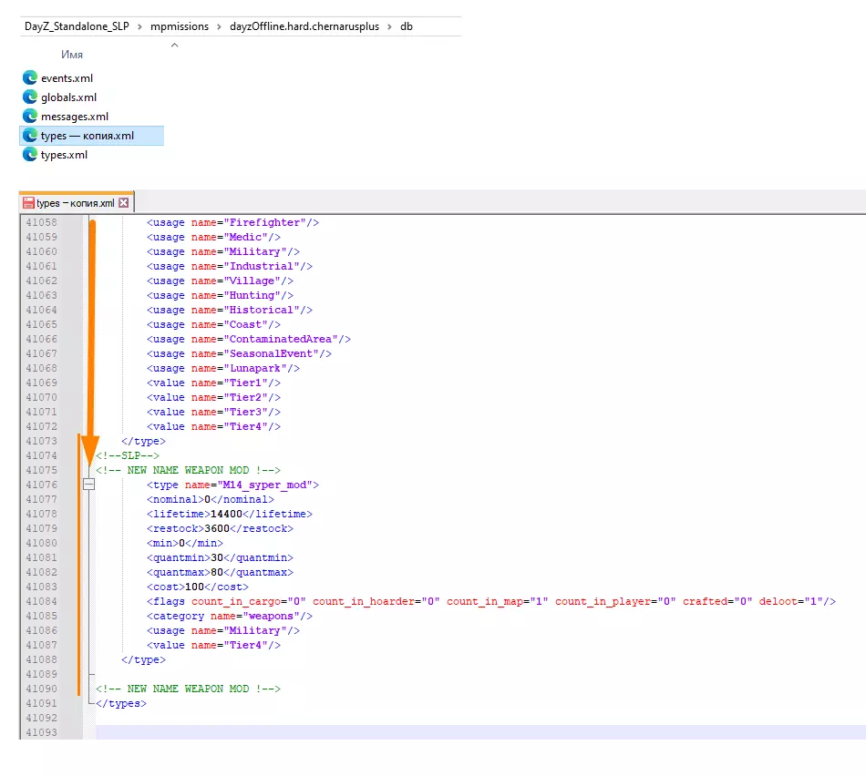 -mod= 字符串位于 -profiles= 之后,就在您查找的位置: serverLocation= -BEpath= -profiles= 添加模组的方法: 先输入分号 [ ; ],然后输入 @ 符号,再输入来自 !Workshop 的模组文件夹名称。 务必在批处理文件 start.bat 中复制 !Workshop 里的模组文件夹名称。 示例:[@New Name Weapon Mod],完整的字符串应如下所示: "-mod=@CF;@DayZ Single Local Player;@New Name Weapon Mod" 模组文件夹名称可以包含空格、下划线(_)以及大小写字母。重要的是要注意,你在这里不要加入任何“个人”内容。 如果模组名称是小写字母开头,那么在批处理文件中也保持原样。 最后,读取行 -mod= 应该只用一个引号 ["] 结束,不要添加空格以及多余的 [;] 或 [@]。 所有内容都应按照基础行示例来: "-mod=@CF;@DayZ Single Local Player" 保存文件。 运行你的 start.bat,然后按照常规流程进行游戏。在某些情况下,为了使模组的更改生效,需要进行服务器重置或在服务器中添加事件、类型相关数据。 因此,请留意您所安装的内容,并阅读作者的建议要求。 所有说明都在模组描述或【模组文件夹】中。 类型示例: 部分.xml文件允许使用<!-- 注释内容 -->这样的括号进行注释。这样你就可以“标记”出是从哪个模组添加的内容,然后在更新SLP时,只需从备份“文件副本”中复制数据即可。