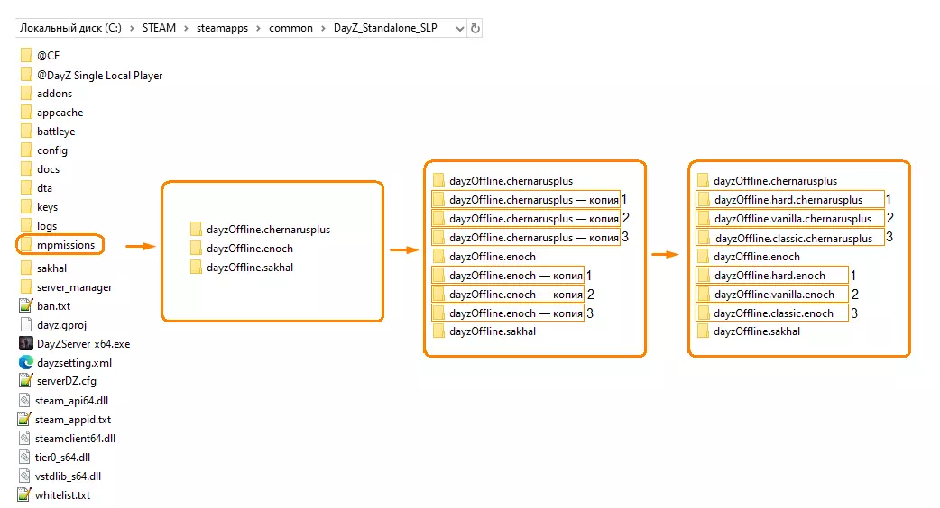 在【mpmissions】文件夹中找到以下标准文件: dayzOffline.chernarusplus dayzOffline.enoch 制作副本: 1. dayzOffline.chernarusplus – 副本 2. dayzOffline.chernarusplus – 副本(2) 3. dayzOffline.chernarusplus – 副本(3) 4. dayzOffline.enoch – 副本 5. dayzOffline.enoch – 副本(2) 6. dayzOffline.enoch – 副本(3) 在dayzOffline与地图名称chernarusplus和enoch之间添加以下内容: .hard. .vanilla. .classic. 重命名为: 1. dayzOffline.hard.chernarusplus 2. dayzOffline.vanilla.chernarusplus 3. dayzOffline.classic.chernarusplus 4. dayzOffline.hard.enoch 5. dayzOffline.vanilla.enoch 6. dayzOffline.classic.enoch