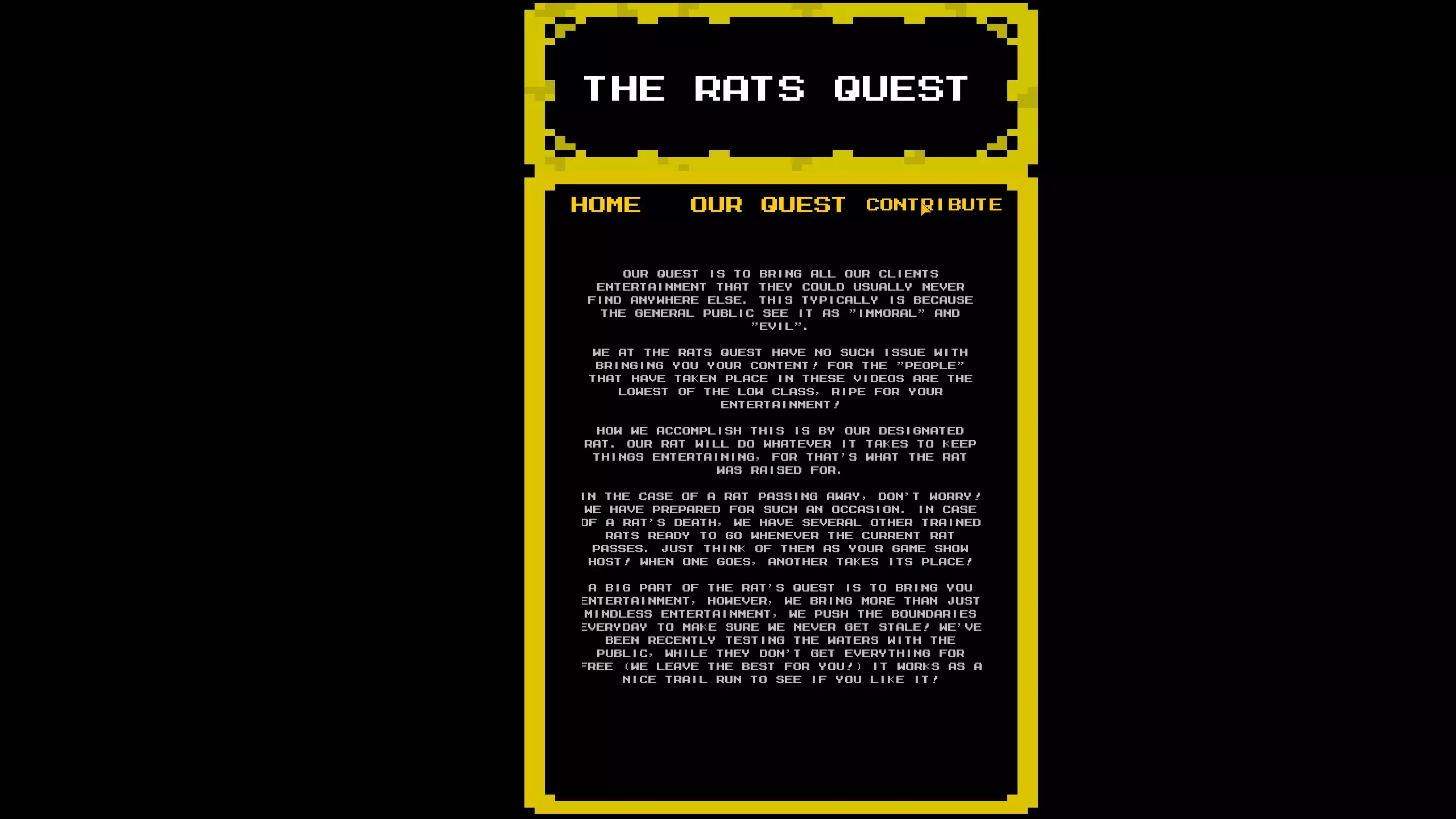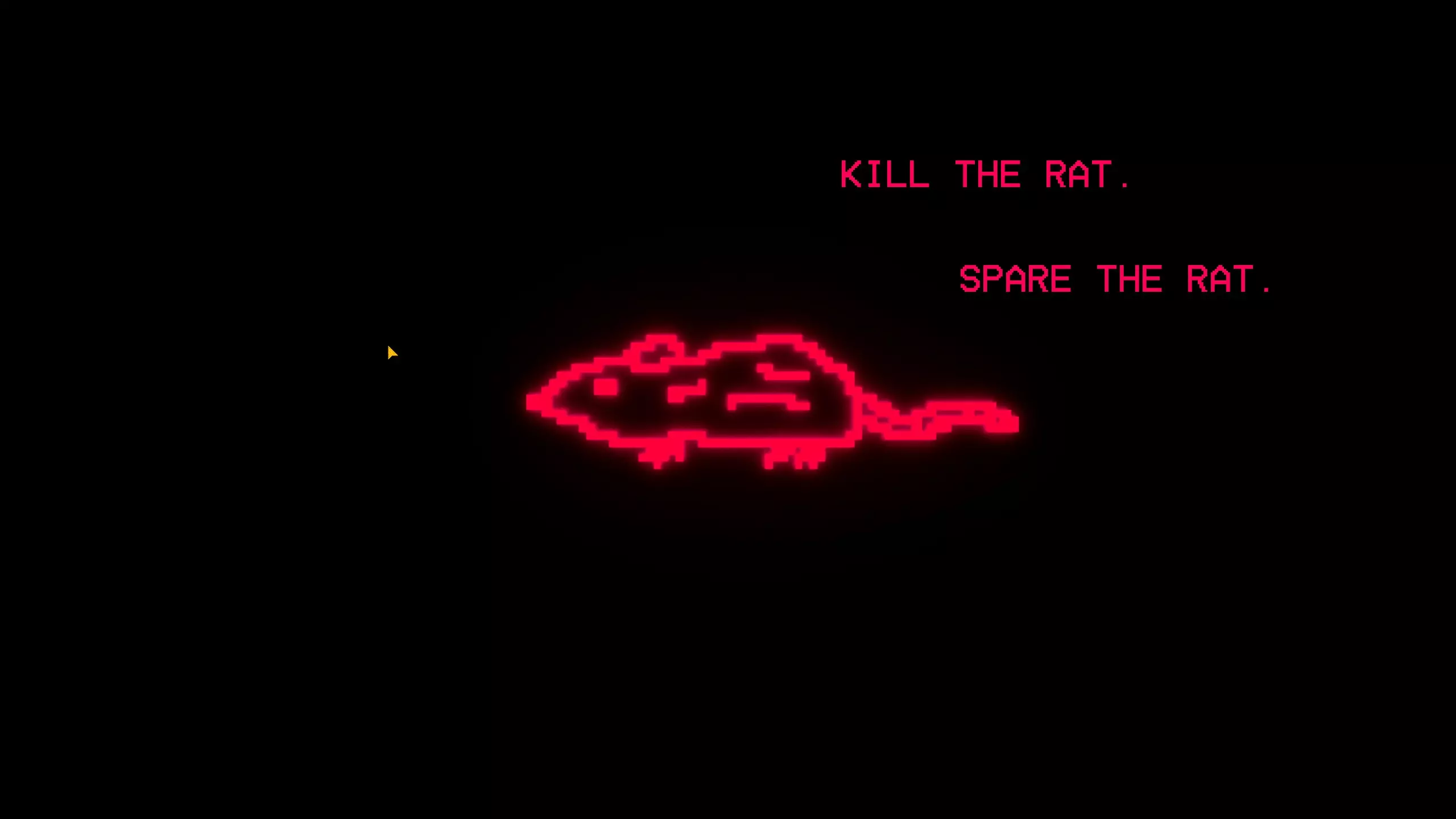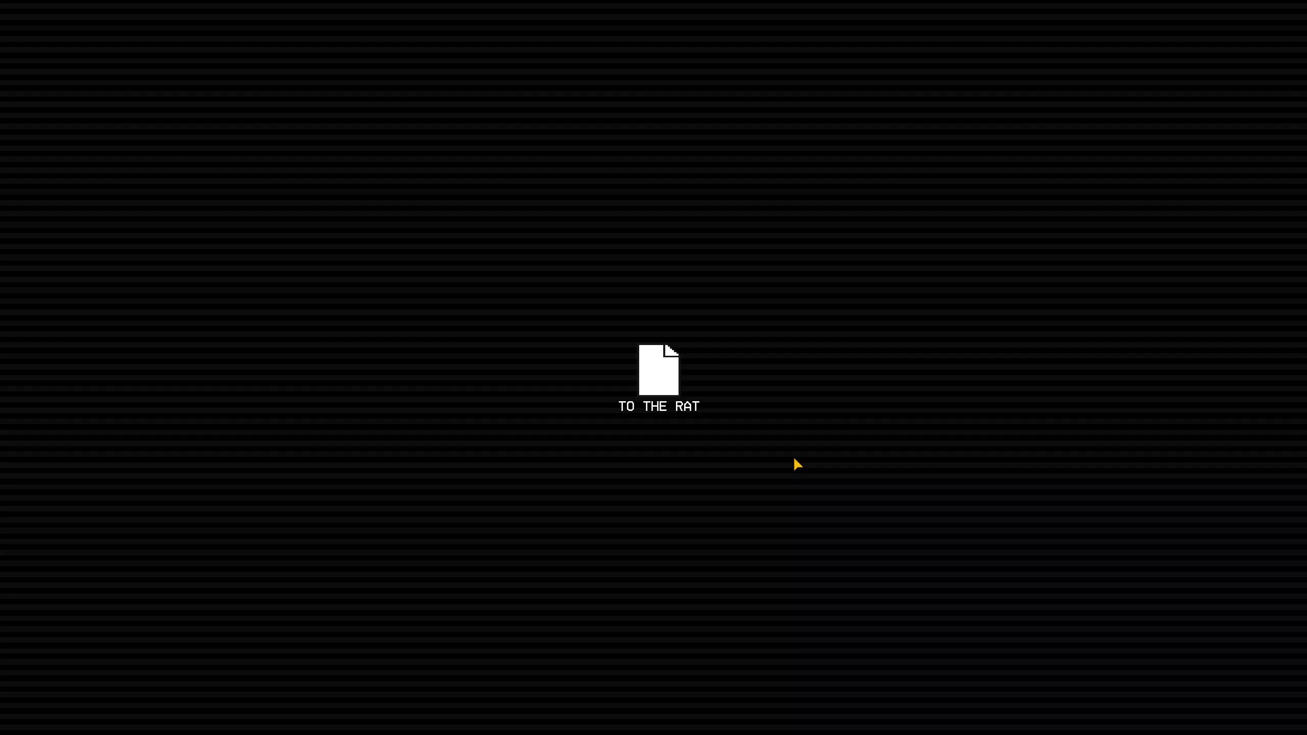根据我的测试,它给出的答案与“输入语句”界面相同,除非你输入的内容在“输入语句”界面中没有对应的响应,这时它会显示: “IM SORRY TO GET YOU MIXED UP IN ALL THIS” “I COULDNT JUST STAY SILENT THOUGH” “I'LL SEND YOU ON YOUR WAY, BUT PLEASE.” “DONT TRUST A RAT” 我猜测我们需要找出MRRat在游戏设定中的名字并在这里输入,因为它会询问是谁在玩,而当你在“ENTER STATEMENT”界面输入MRRat时,它会显示“WE BOTH KNOW THATS NOT YOUR REAL NAME”。我已经尝试过Christopher Matney、Christopher和Chris,但都没有得到不同的响应。 完成限时部分还能解锁困难模式,该模式会带来反转、冰冻和快速老鼠的效果。老鼠训练:介绍 我把这部分称为老鼠训练,因为它与驱动器上某个文件中描述的内容相符。有几个秘密会以这些老鼠训练界面结束。第一次进入时,界面会显示“我要问你几个问题。”并给出一些选项。除了其他老鼠训练界面会根据你的选择给出不同内容外,我还没发现这些选择会带来其他变化。选项如下: 奶酪还是披萨 面包还是一杯水 宠物蛇还是宠物猫 在这三个问题之后,会出现一个错乱的选项,再次点击后会显示“暂时就这些了。尽快回到这里。”“我准备了些有趣的东西” 之后你会回到主菜单,其余的老鼠训练界面都与入口相关。 老鼠训练:杀死/放过老鼠 在第一个房间的右下角,墙上有个洞通向黑色地砖。触碰黑色地砖会打开老鼠训练界面。