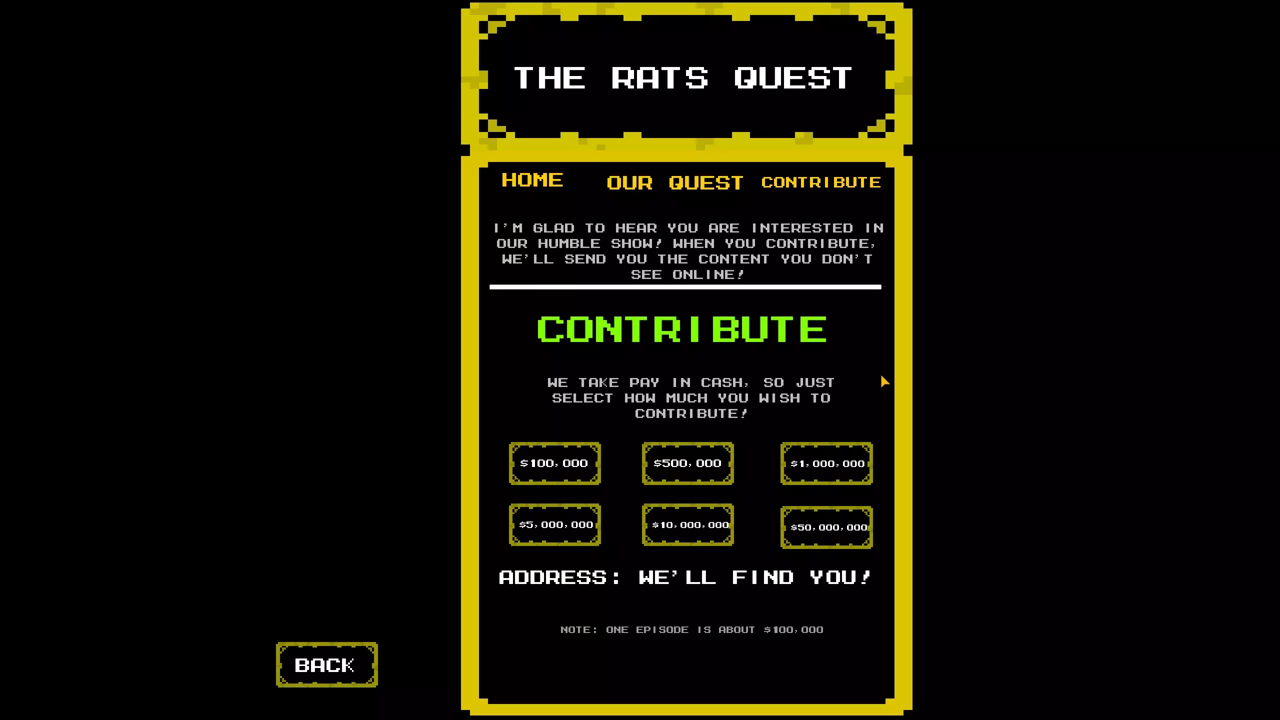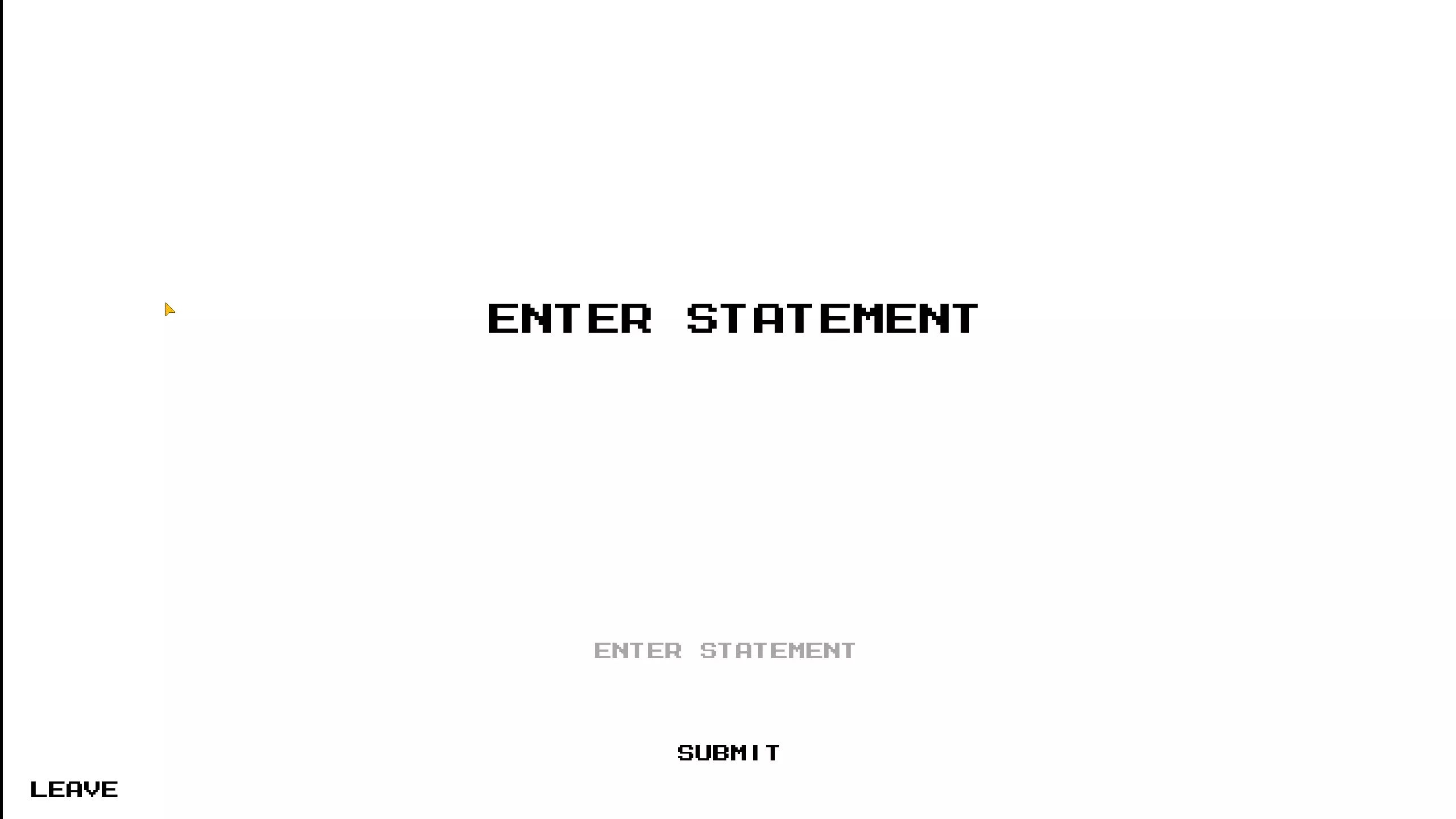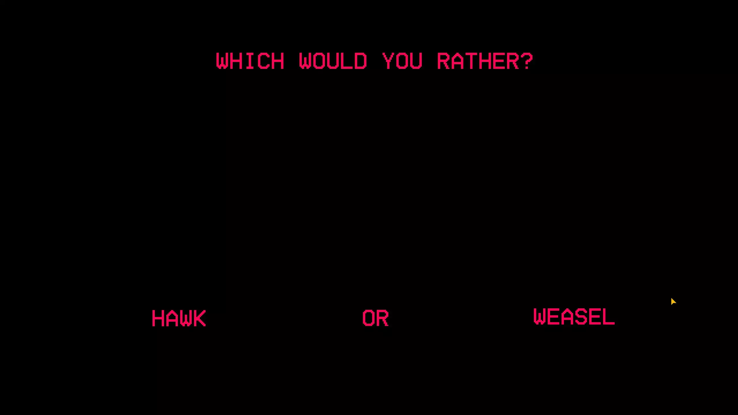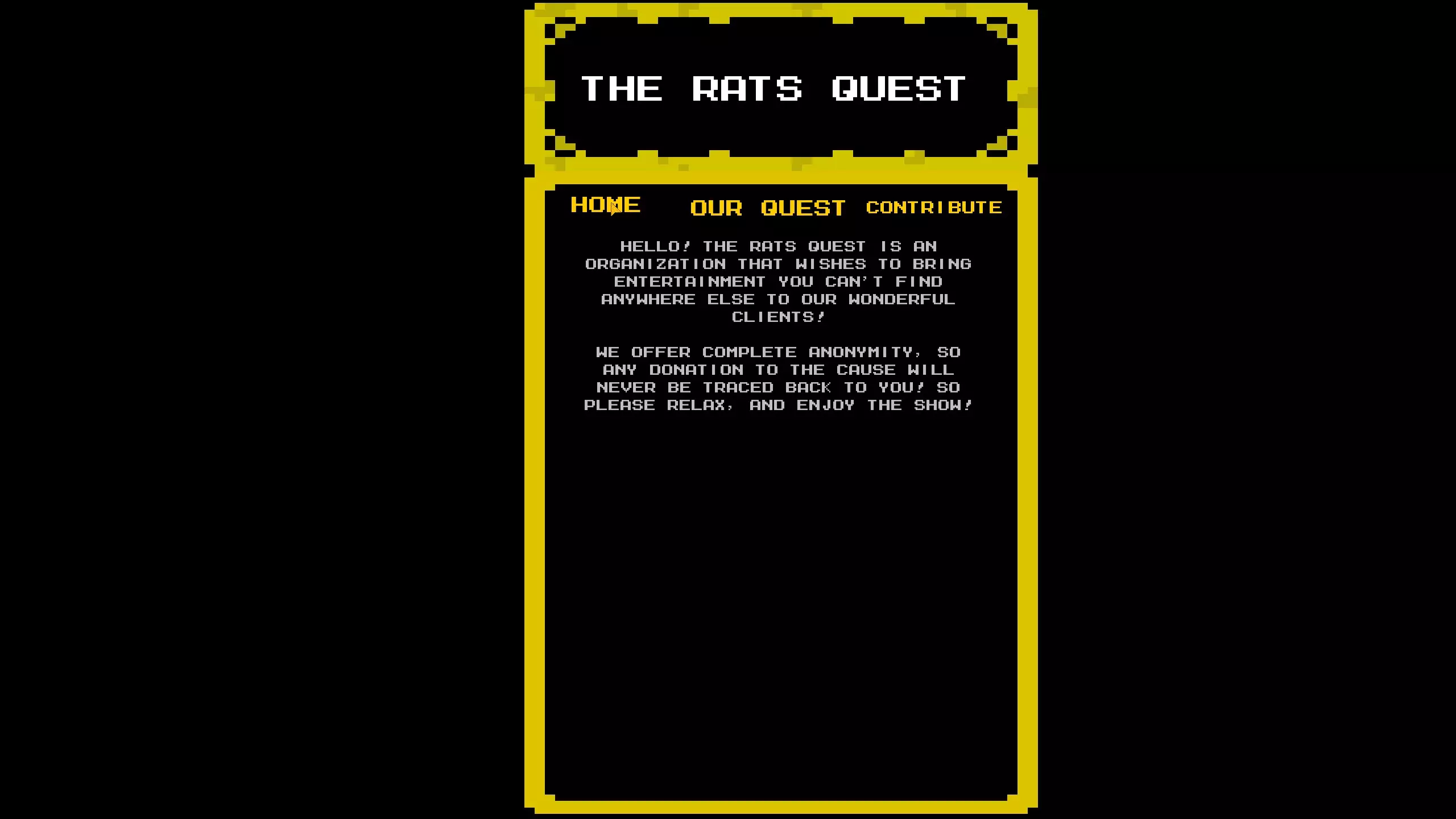 根据我的测试,它给出的答案与“输入语句”界面相同,除非你输入的内容在“输入语句”界面中没有对应的响应,这时它会显示: “IM SORRY TO GET YOU MIXED UP IN ALL THIS” “I COULDNT JUST STAY SILENT THOUGH” “I'LL SEND YOU ON YOUR WAY, BUT PLEASE.” “DONT TRUST A RAT” 我猜测我们需要找出MRRat在游戏设定中的名字并在这里输入,因为它会询问是谁在玩,而当你在“ENTER STATEMENT”界面输入MRRat时,它会显示“WE BOTH KNOW THATS NOT YOUR REAL NAME”。我已经尝试过Christopher Matney、Christopher和Chris,但都没有得到不同的响应。 完成限时部分还能解锁困难模式,该模式会带来反转、冰冻和快速老鼠的效果。老鼠训练:介绍 我把这部分称为老鼠训练,因为它与驱动器上某个文件中描述的内容相符。有几个秘密会以这些老鼠训练界面结束。第一次进入时,界面会显示“我要问你几个问题。”并给出一些选项。除了其他老鼠训练界面会根据你的选择给出不同内容外,我还没发现这些选择会带来其他变化。选项如下: 奶酪还是披萨 面包还是一杯水 宠物蛇还是宠物猫 在这三个问题之后,会出现一个错乱的选项,再次点击后会显示“暂时就这些了。尽快回到这里。”“我准备了些有趣的东西” 之后你会回到主菜单,其余的老鼠训练界面都与入口相关。 老鼠训练:杀死/放过老鼠 在第一个房间的右下角,墙上有个洞通向黑色地砖。触碰黑色地砖会打开老鼠训练界面。