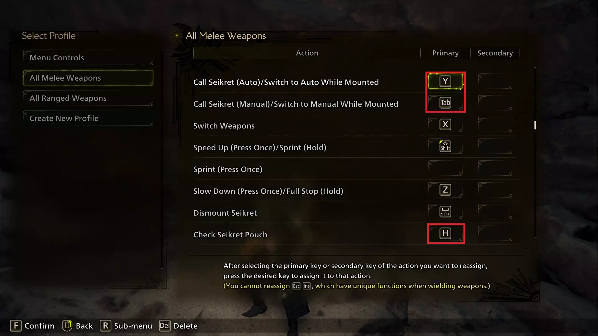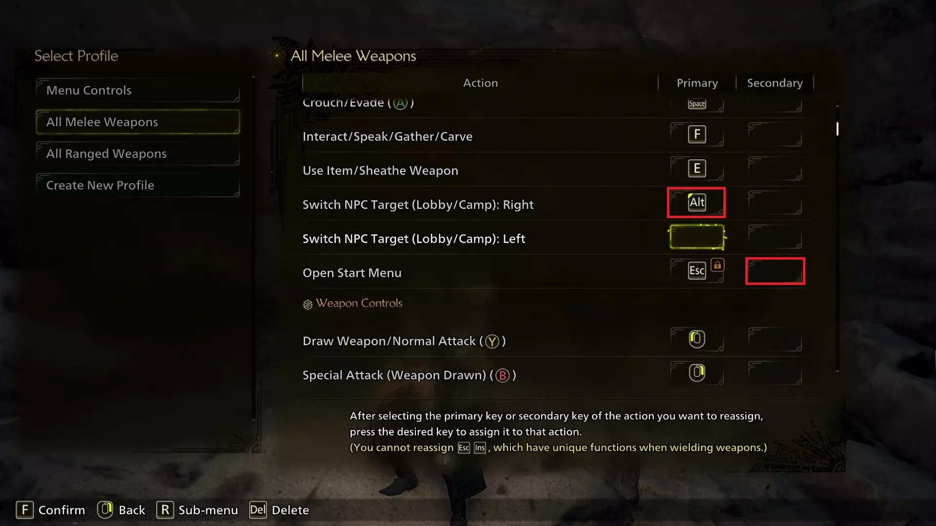 切换NPC目标(大厅/营地):右键已从R键更改为左Alt键。此选项用于当你在城镇中有多个互动目标靠近时,可以在它们之间进行切换。自游戏正式发布以来,我确实发现了一些需要用到此功能的场景(感谢某个笨蛋),而且Alt键作为直观的按键使用效果很好。 开始菜单的次要输入键H已解绑。(使用Delete键可以解绑按键!)我认为这个次要输入键没有必要,解绑后可以释放该按键。 武器控制