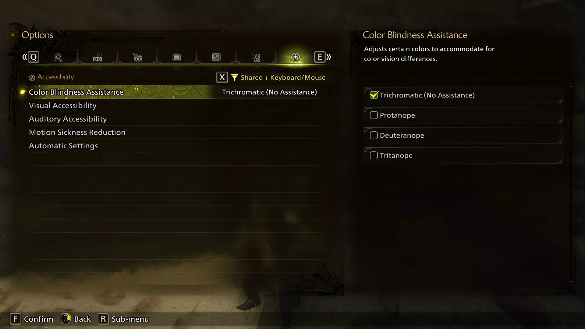 色盲辅助功能会改变某些HUD元素的颜色,包括武器专属元素,例如充能斧的瓶槽。如果你有任何形式的色盲问题,可以尝试使用该功能。 视觉辅助、听觉辅助和减少晕动症功能,我认为只是整合了之前已有的选项(如动态模糊或HUD大小)的快速菜单。