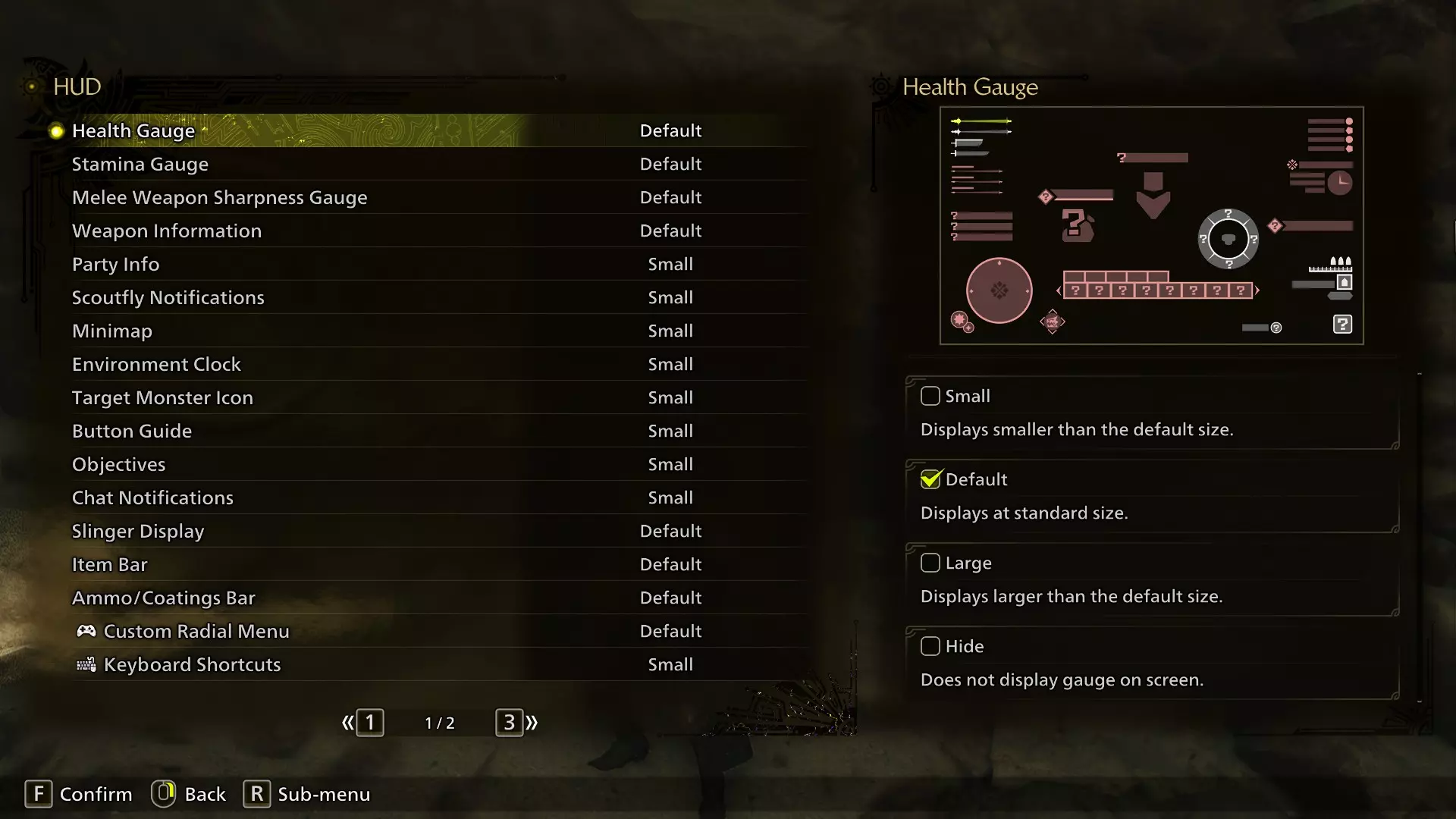 在第二页,你可以设置生命/耐力/锋利度计量条的显示方式,选择始终显示或仅在战斗中显示。 字幕文本大小默认对那些不需要依赖字幕理解游戏的人来说有点太大了——如果你确实需要字幕,或许应该保持默认大小或调大。还有许多其他字幕选项可供自定义,例如隐藏式字幕、说话人姓名或字幕背景。 如果多人狩猎对你来说视觉效果过于杂乱,可以禁用队友命中特效/暴击特效。
